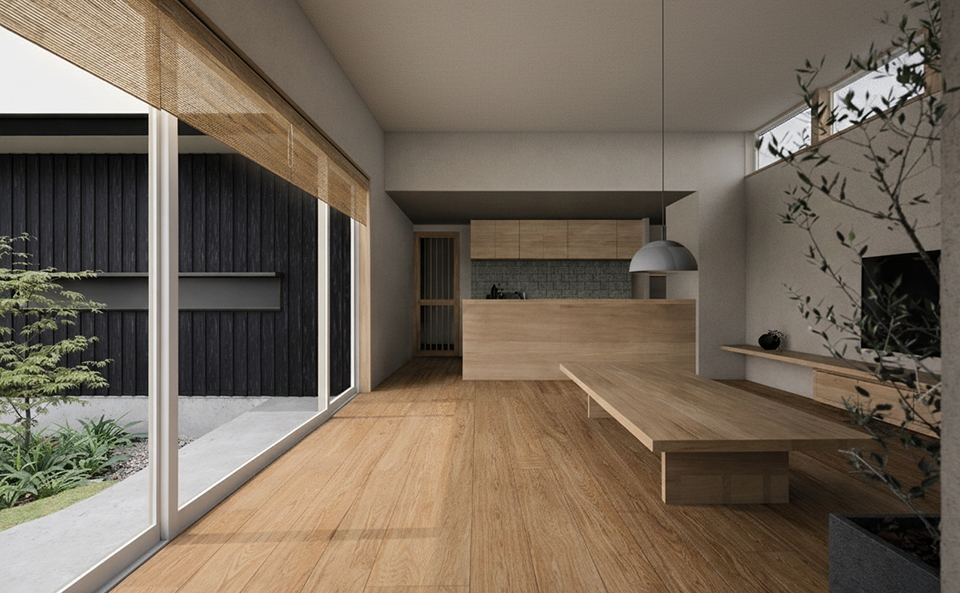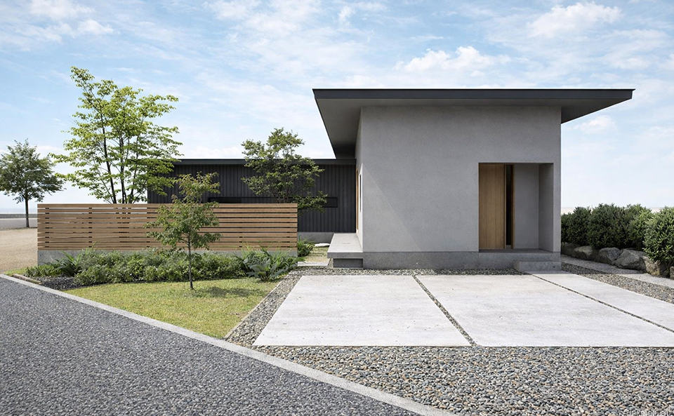 山々に囲まれた自然豊かな場所に佇む平屋の住まいです。家族が集うダイニングは外とのつながりを感じられる開放的な空間とし、リビングはそれぞれの時間を過ごせる落ち着いた空間としました。対照的な空間での居心地を是非ご体感ください。