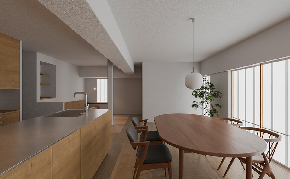 ご家族が選択されたのは、マンションでの自分たちらしい暮らし。既存の窓を手掛かりにしたプランが、住まいとしての懐を深めてくれる。どの場所にも気持ち良い空気が漂うよう、均質な心で設計された住まいです。
