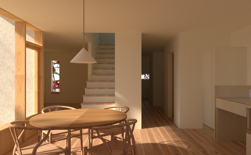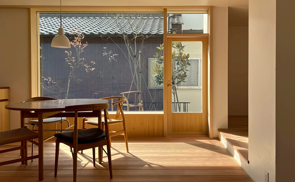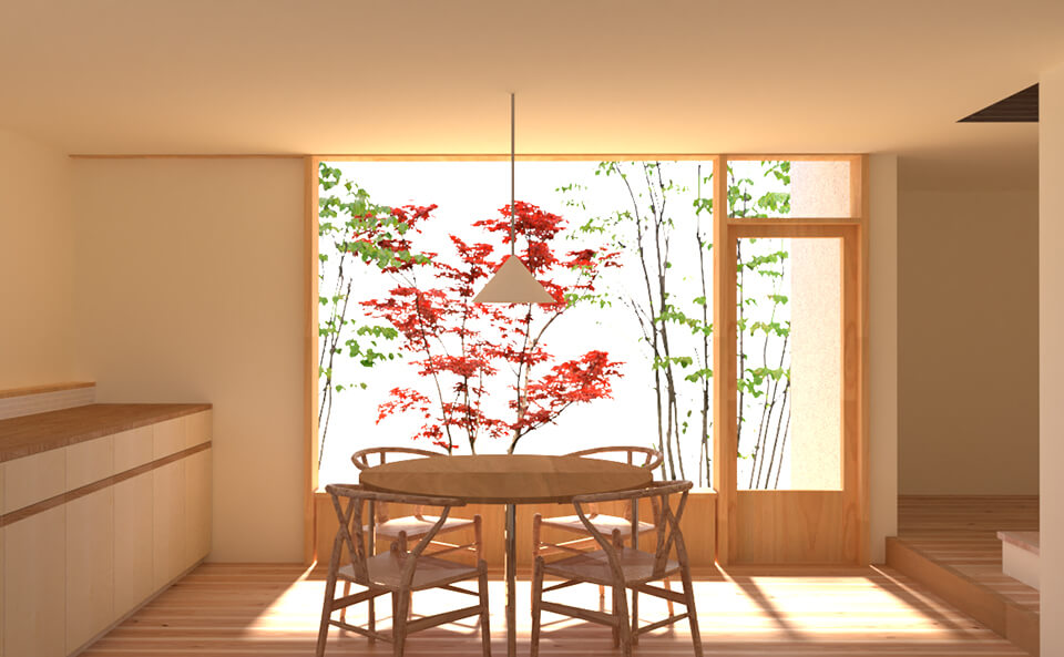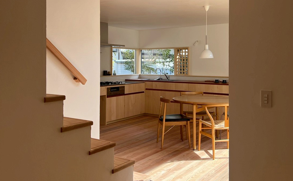 古くからの住宅地にある旗竿地。敷地には余白を残し、緑を植えることで周囲の家との距離感を保つ。小さな家の中には大きなひとつながりの空間をつくりました。周りを建物に囲まれ、町に包まれる暮らし。確かにその町に住んでいる、そんな感覚を大切にできる住まいです。
