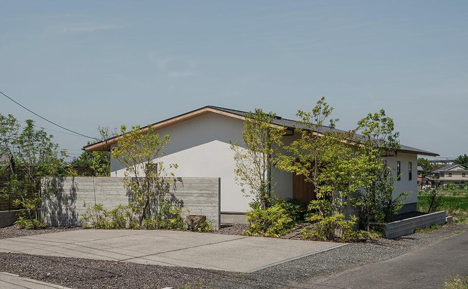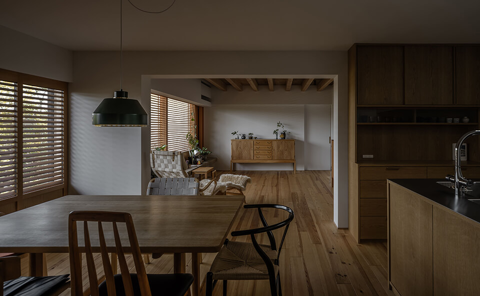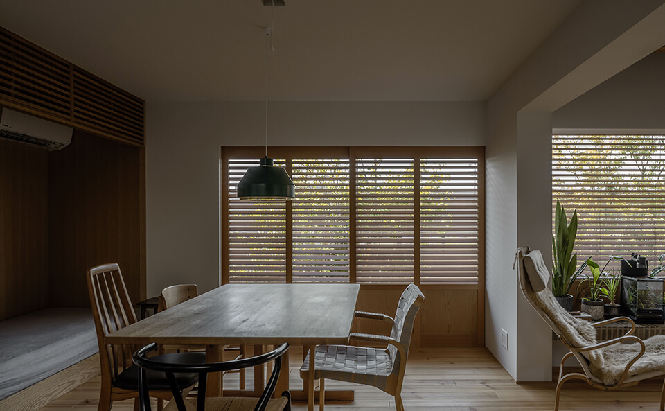 あたたかみのある自然素材や緑、美しい光を組み合わせ、暮らしに寄り添う豊かな住まいを丁寧に設計しました。大きな窓とほどよく囲まれた壁が空間にリズムと奥行きをもたらし、内と外の境界をやわらかくつなげています。