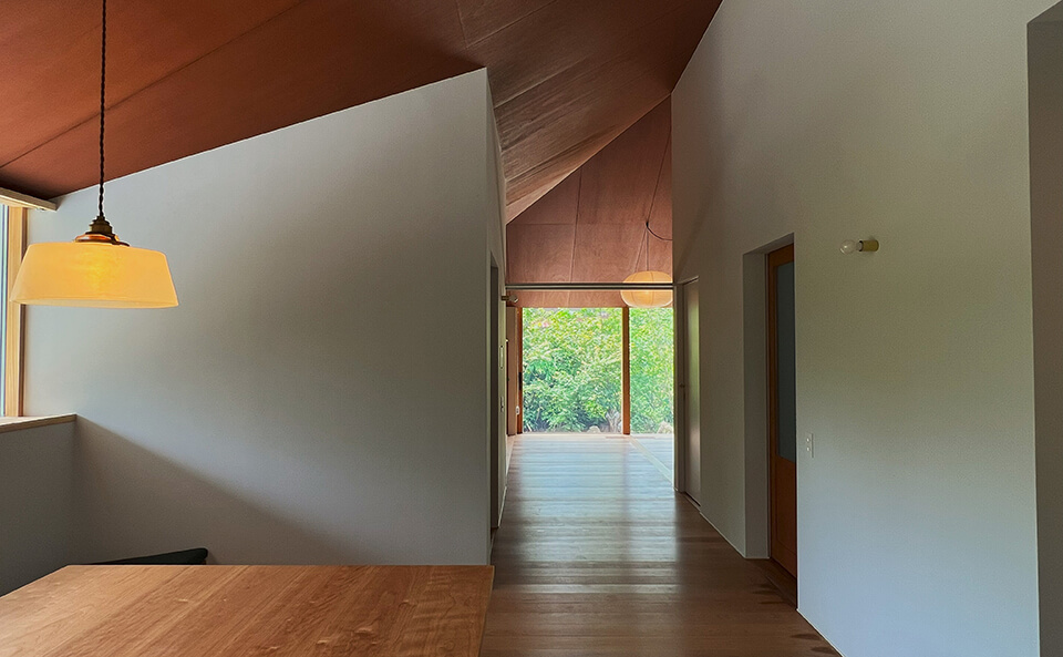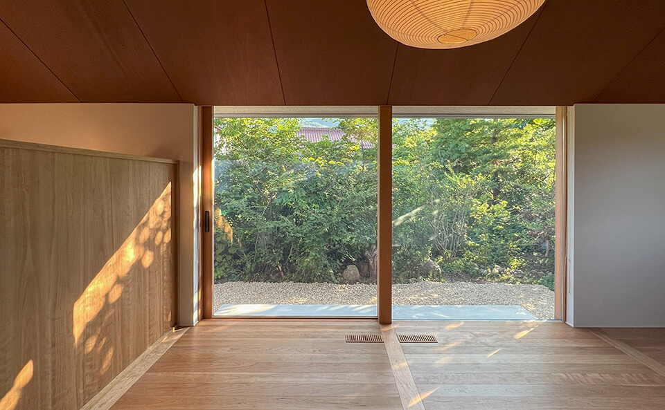 敷地の中に元々あった豊かな植栽を出来る限り活かして家中どこからも緑を楽しむ事ができる住まいです。のどかな周辺環境や風景に馴染むよう入母屋形状のプランとし、家中の温熱環境はばらつきがでないよう第一種換気システムと床下エアコンを採用しております。