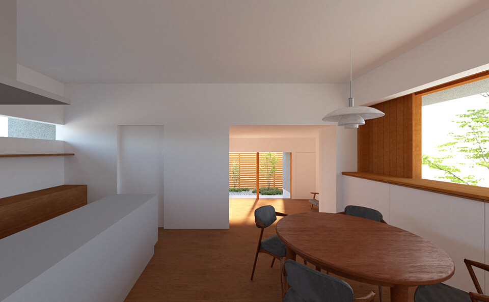 四方から日の入るおおらかな土地。窓から取り込まれる光や風景により自然と時間や季節を感じる空間としました。