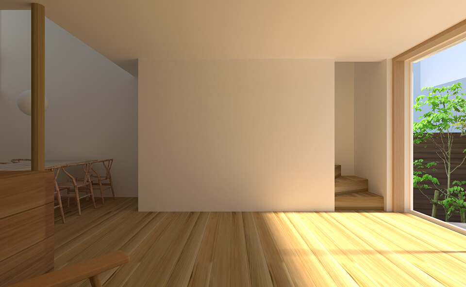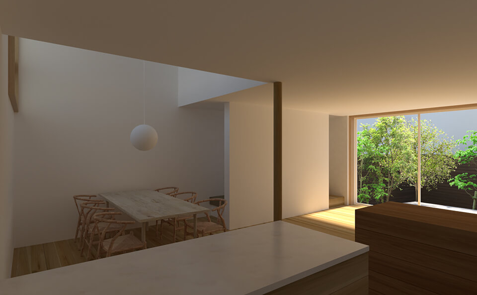 南北に細長い敷地に建つ家。将来建て替えが想定される南側に大きく開くのではなく、北側に空の見える吹抜けを設け、安定した光と視線の抜けを内部に引き込んだ。天井を抑え庭へと連続する南の水平的な空間と、吹抜けによって空へと伸びる北の垂直的な空間。それらが大きなワンルームの中で重なり、多様な居場所をもつおおらかな家。