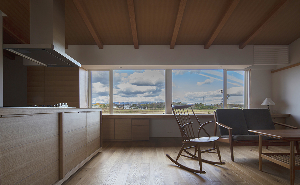 北側には窓いっぱいの景色、南側にはアクティブに使える広大な敷地。L D Kは南北への開放性を持った大きな広間で構成されつつも断熱性・耐震性などの機能面も充実されており、のびやかさのある居心地の良い住まいです。