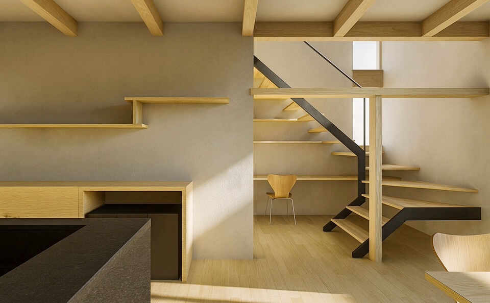 世代交代で建替えの多い住宅街のなかでも周囲の環境に左右されないように窓の開け方を考えました。生活雑貨が際立つようにシンプルでモダンな空間にしつつ、随所に和の要素を取り入れた落ち着きのある空間です。