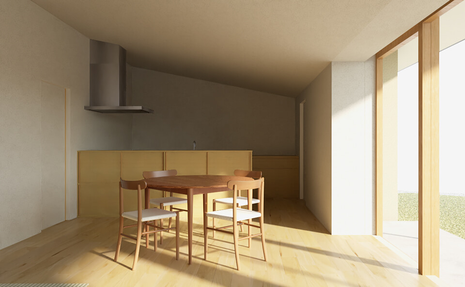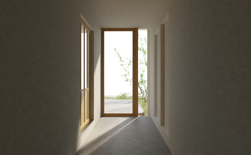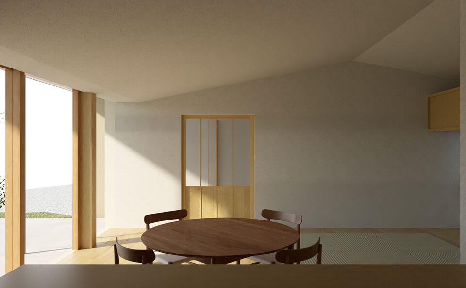 周辺に田園と山が広がる、自然豊かな敷地での計画です。自然と暮らしをつなぐ土間を中心に、周囲の風景と呼応する住まいを計画しました。光や風、田園と山並みの気配が暮らしに寄り添うように入り込みます。控えめで素朴な佇まいに、和の趣と現代の暮らしやすさを重ねています。田園と山並みが暮らしの一部になる、この住まいならではの居心地をご体感ください。