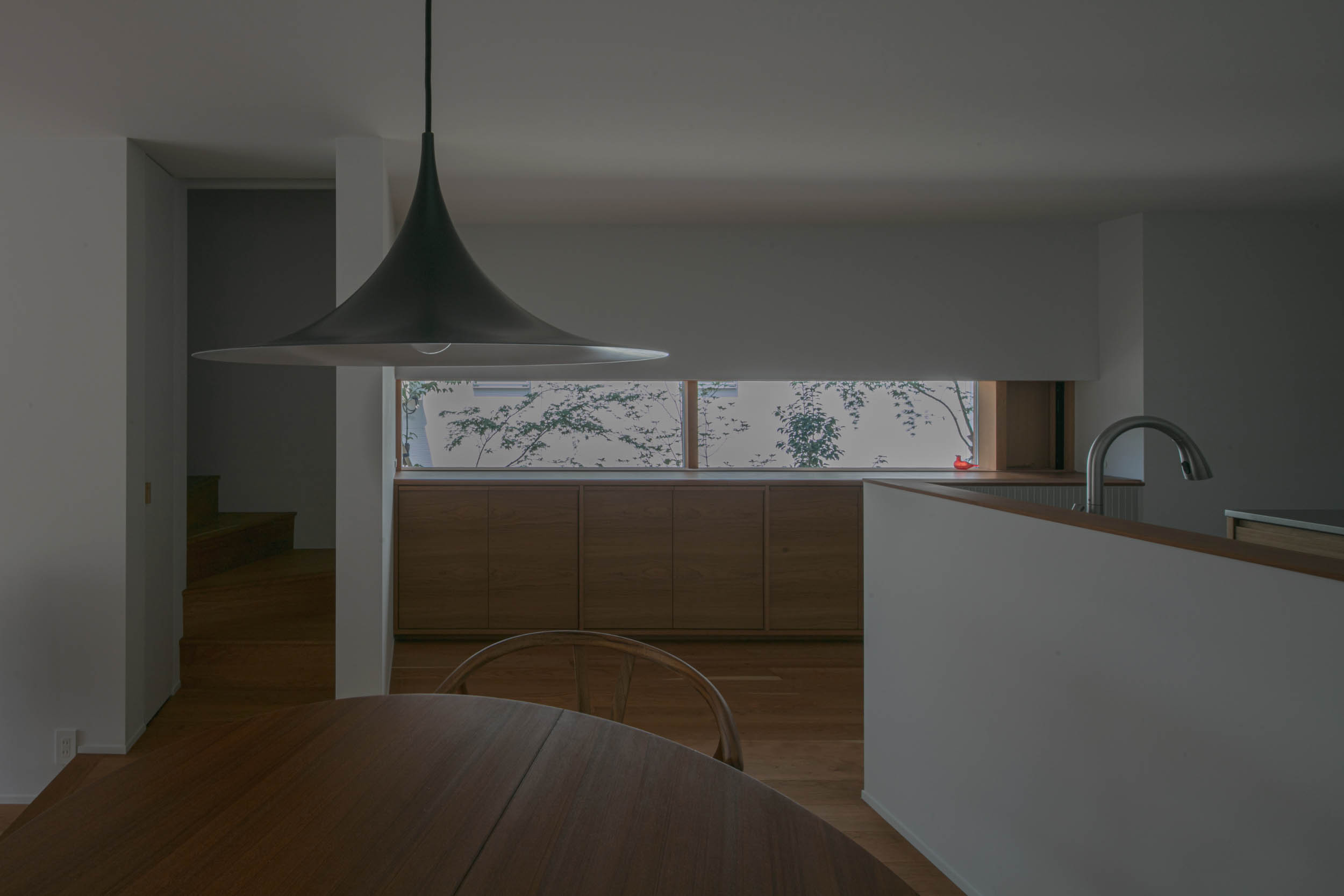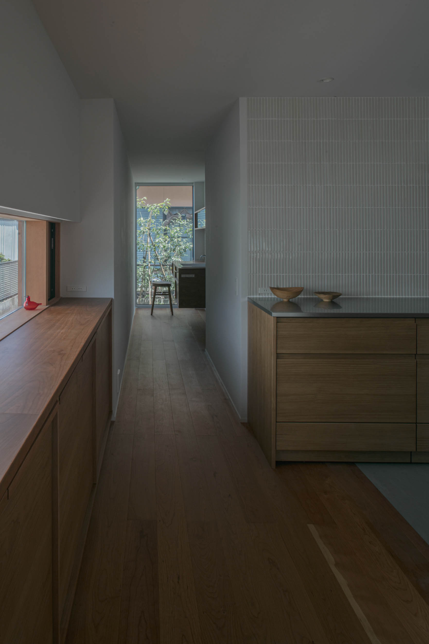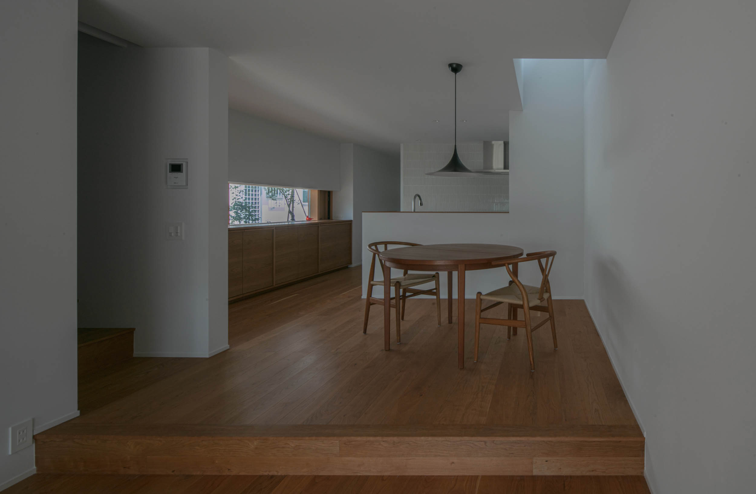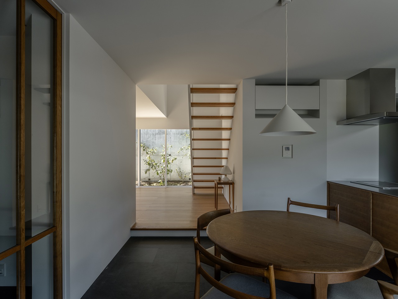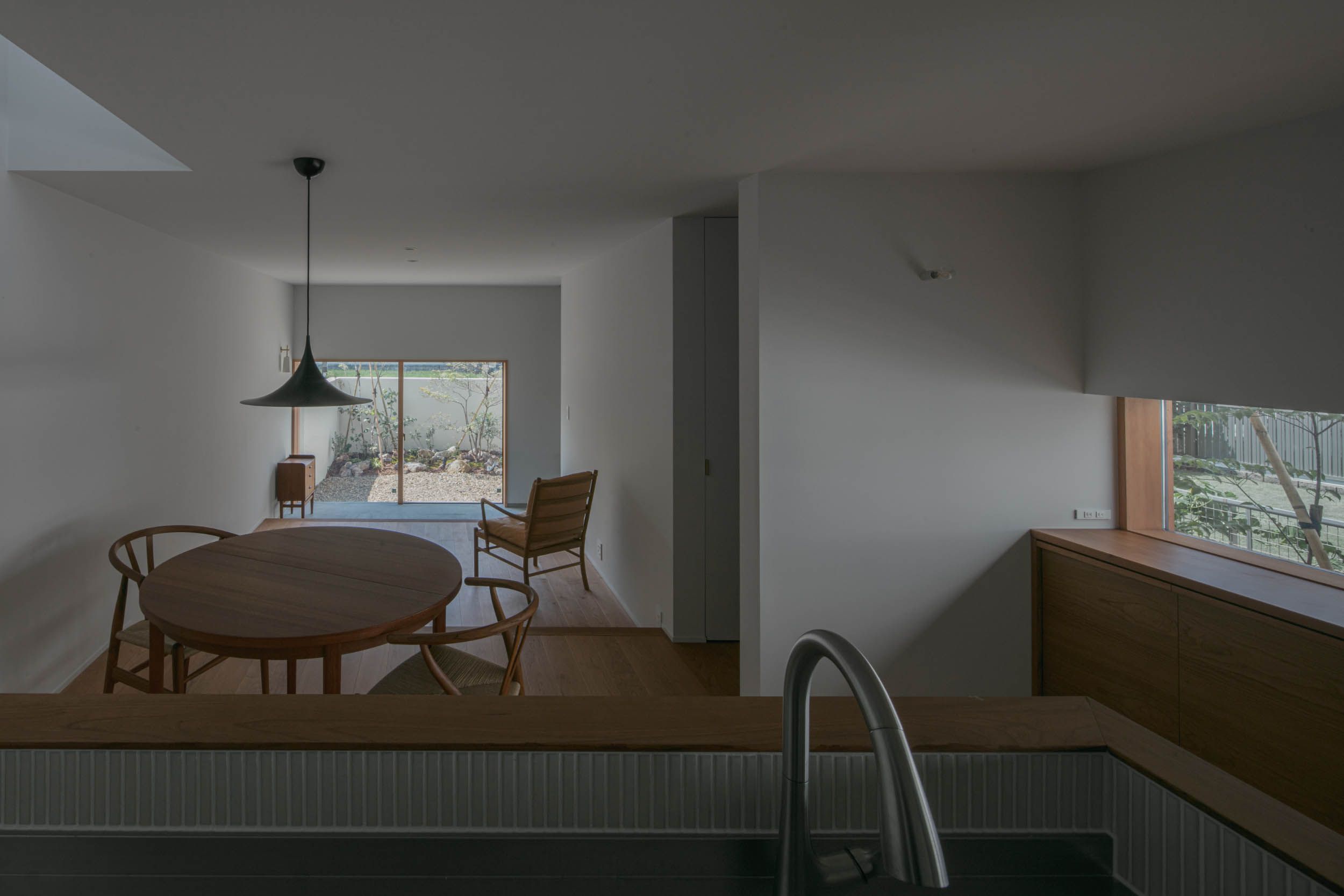 露地に面する細く長い土地の形状を活かした住まい。周辺環境を読み取った光の取り入れ方や視線の抜けが、間口の狭さを感じない空間をつくります。 視線が奥まですうっと抜けるような奥行きを感じる住まいです。