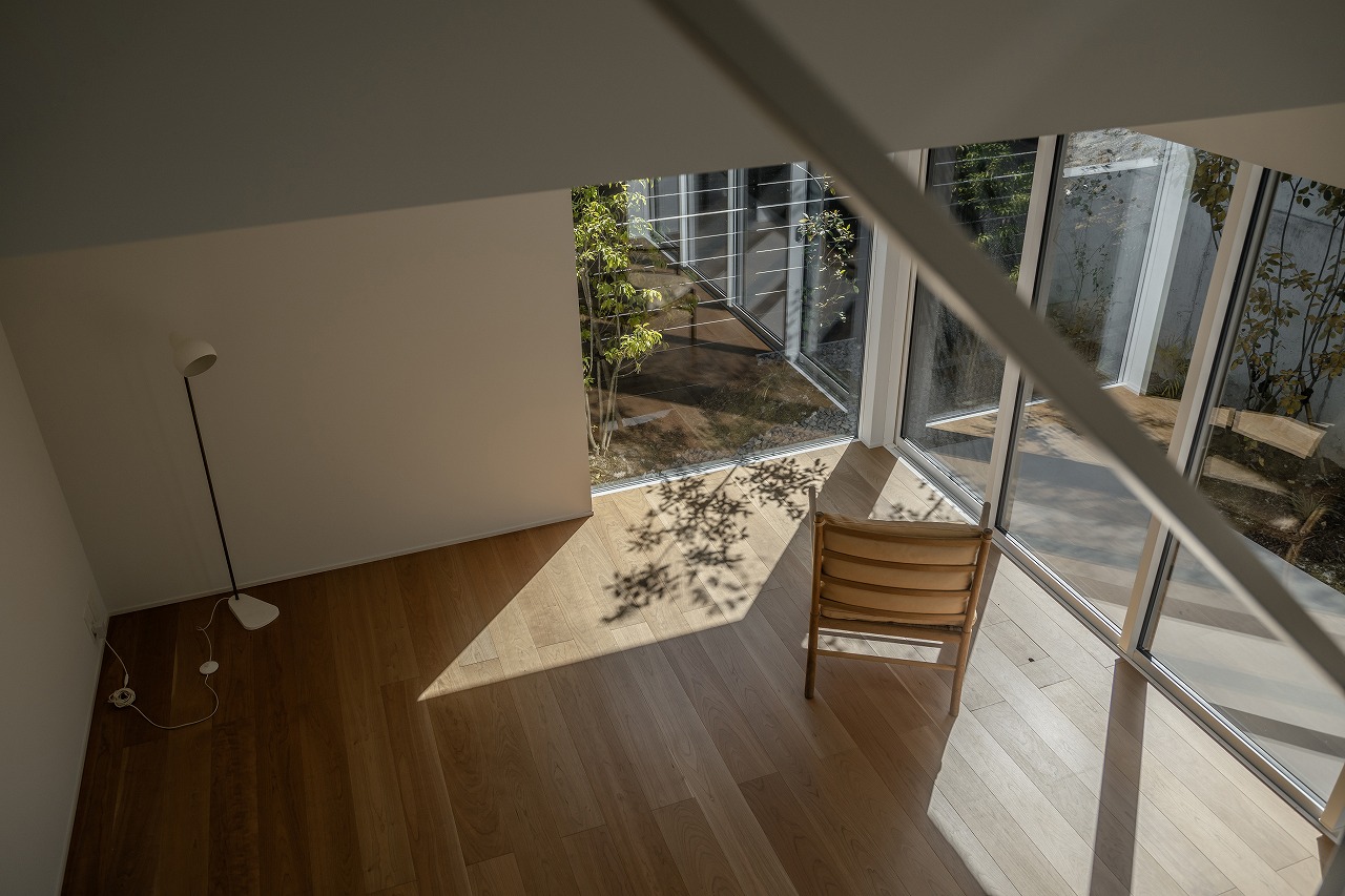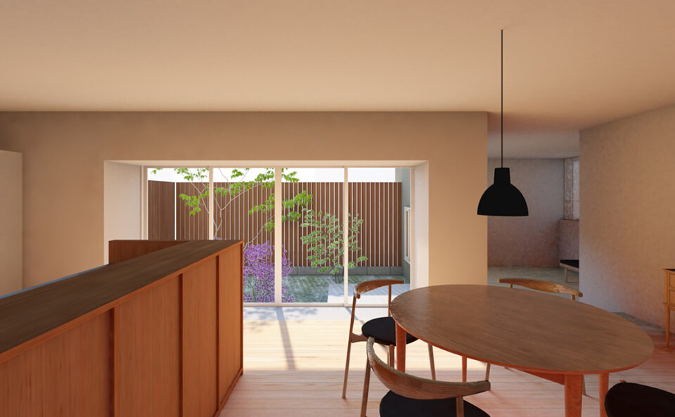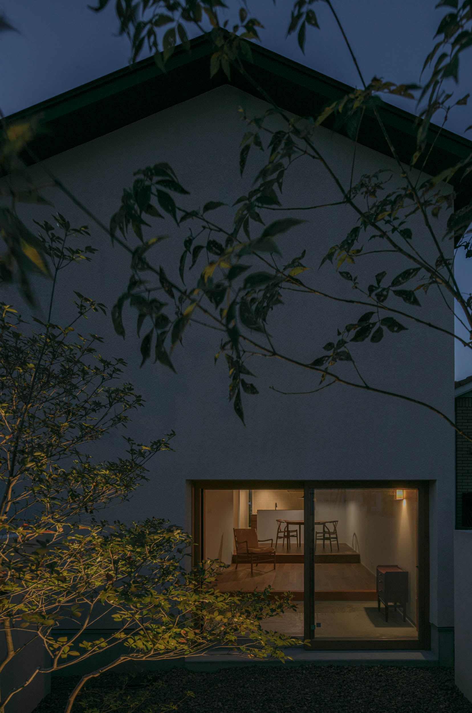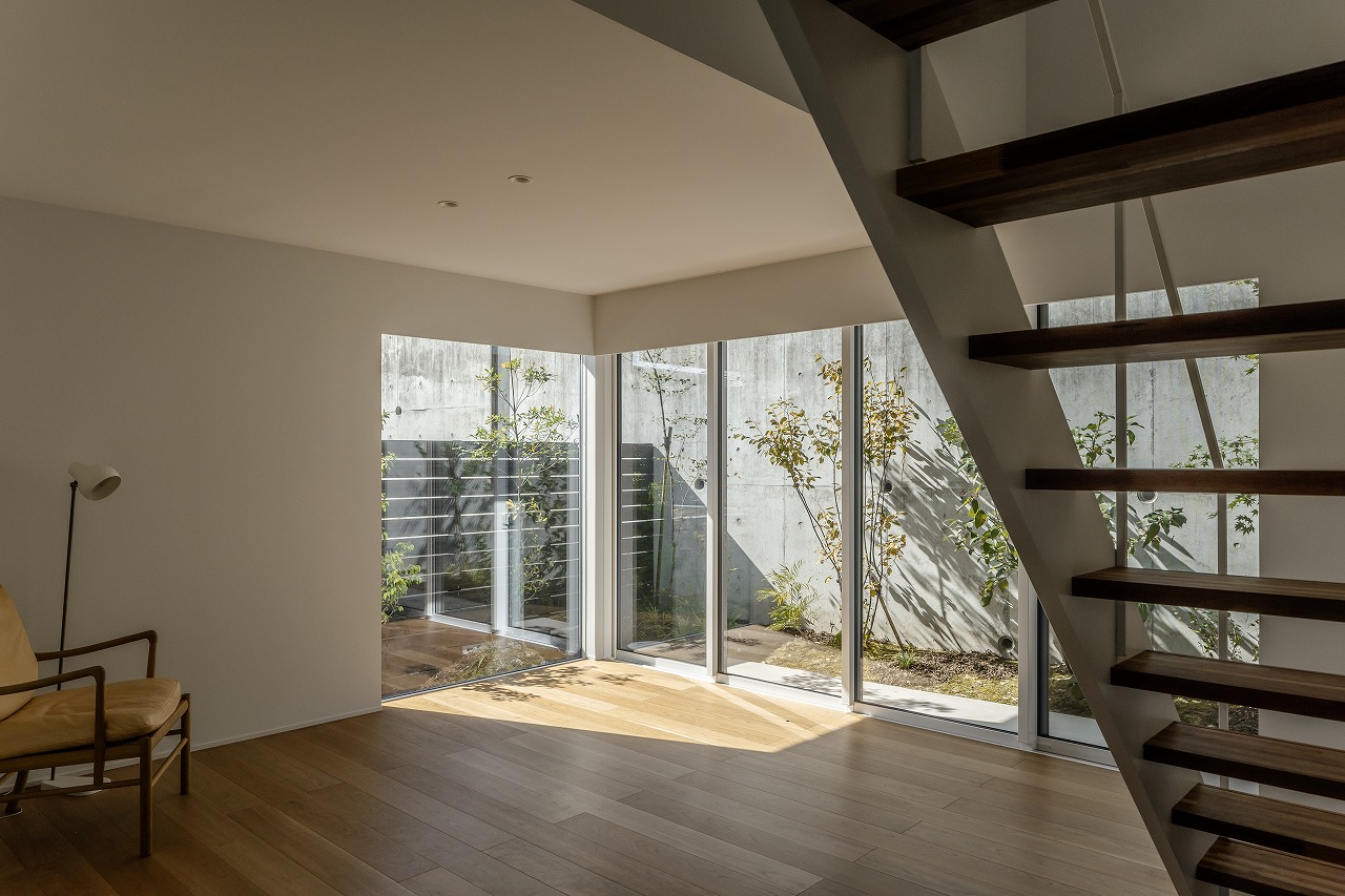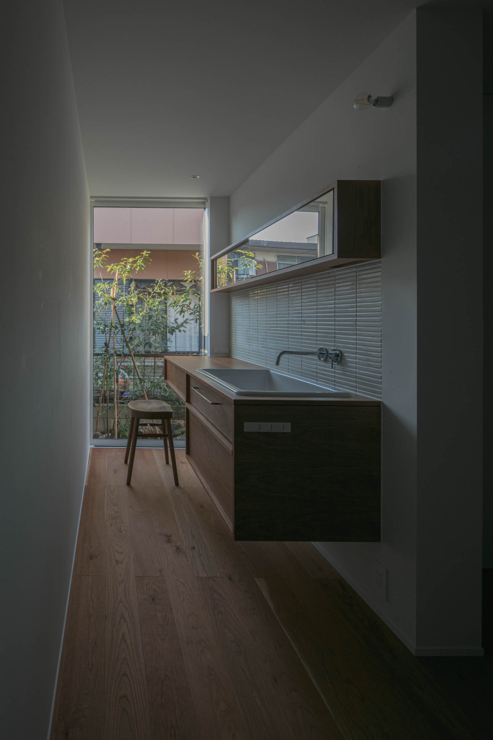 露地に面する細く長い土地の形状を活かした住まい。周辺環境を読み取った光の取り入れ方や視線の抜けが、間口の狭さを感じない空間をつくります。 視線が奥まですうっと抜けるような奥行きを感じる住まいです。