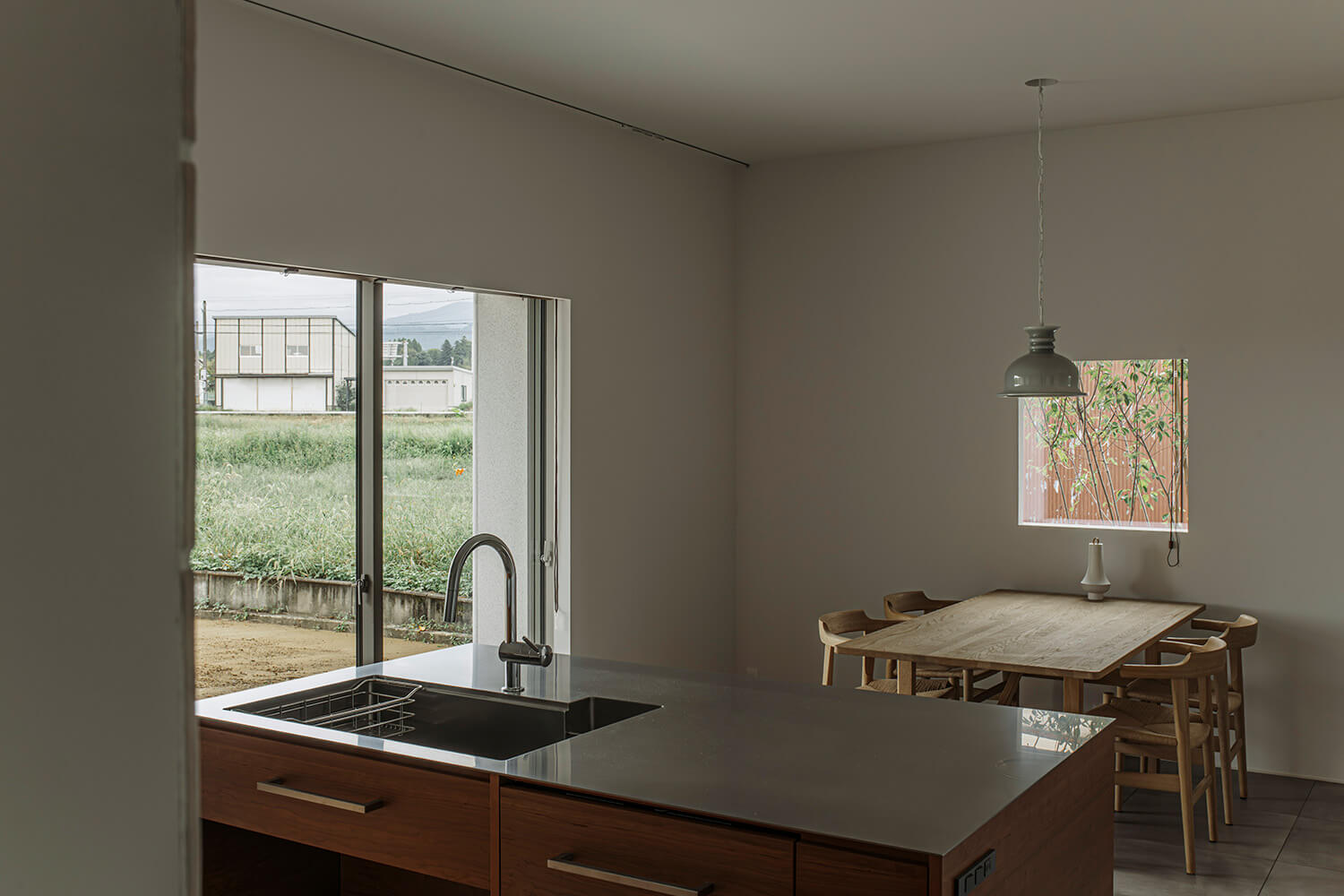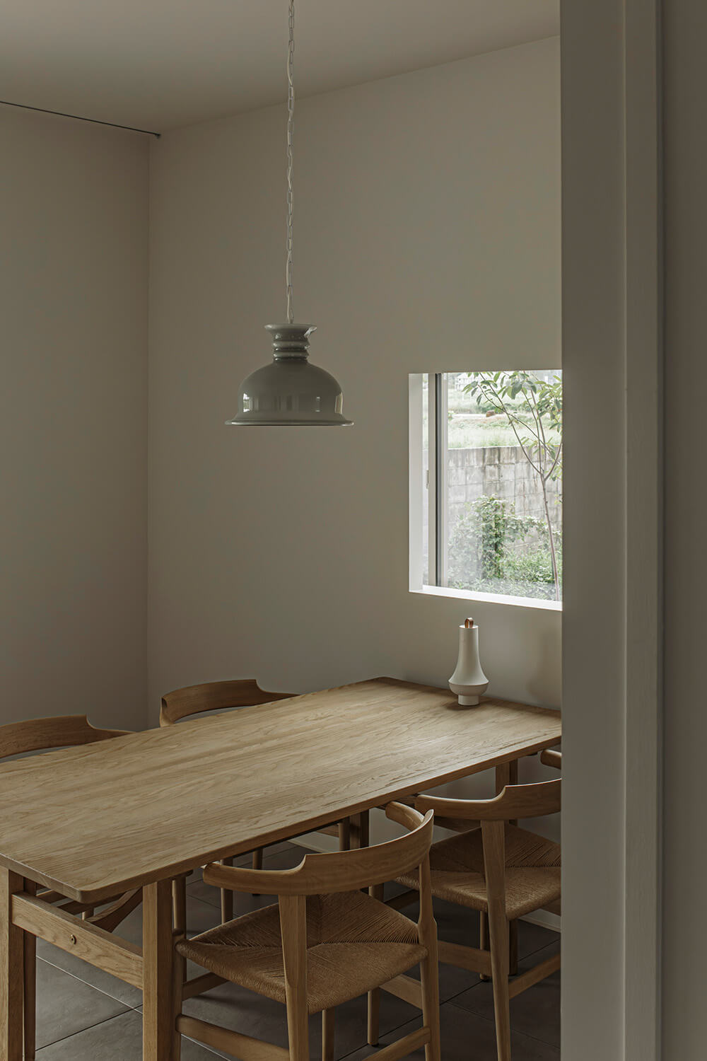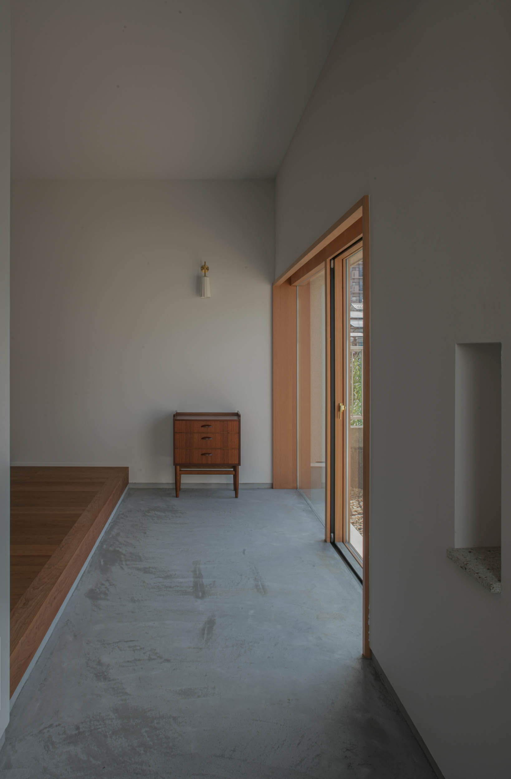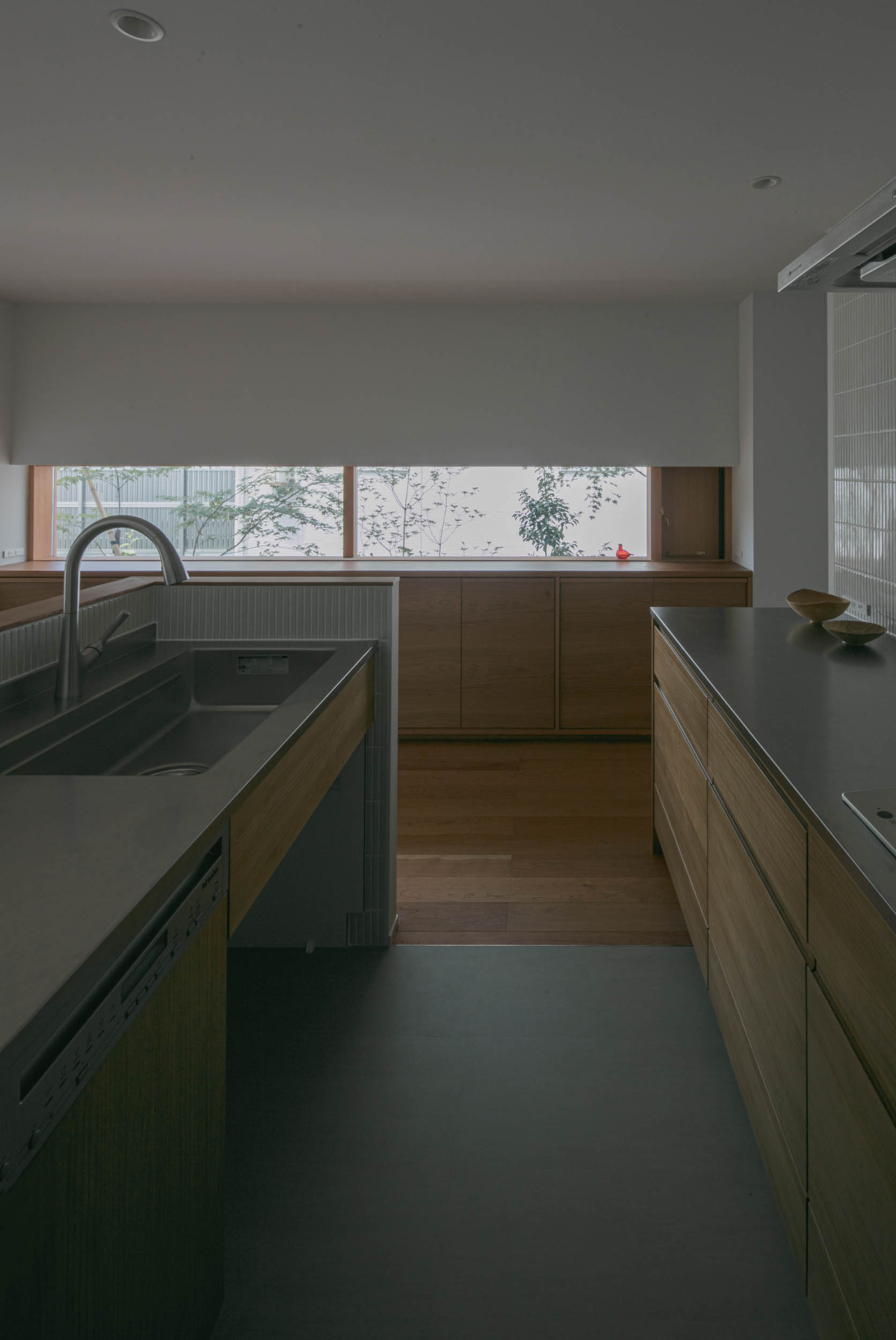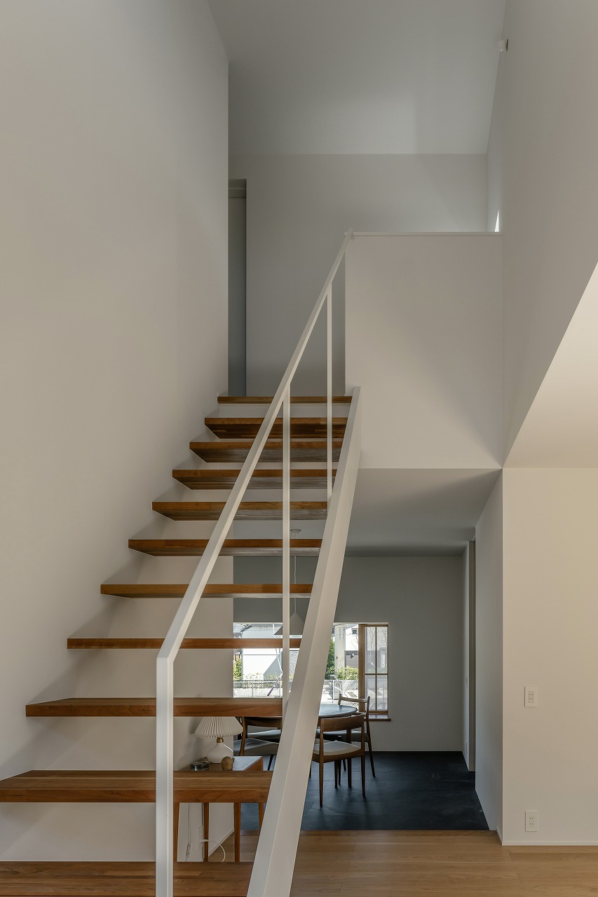 露地に面する細く長い土地の形状を活かした住まい。周辺環境を読み取った光の取り入れ方や視線の抜けが、間口の狭さを感じない空間をつくります。 視線が奥まですうっと抜けるような奥行きを感じる住まいです。