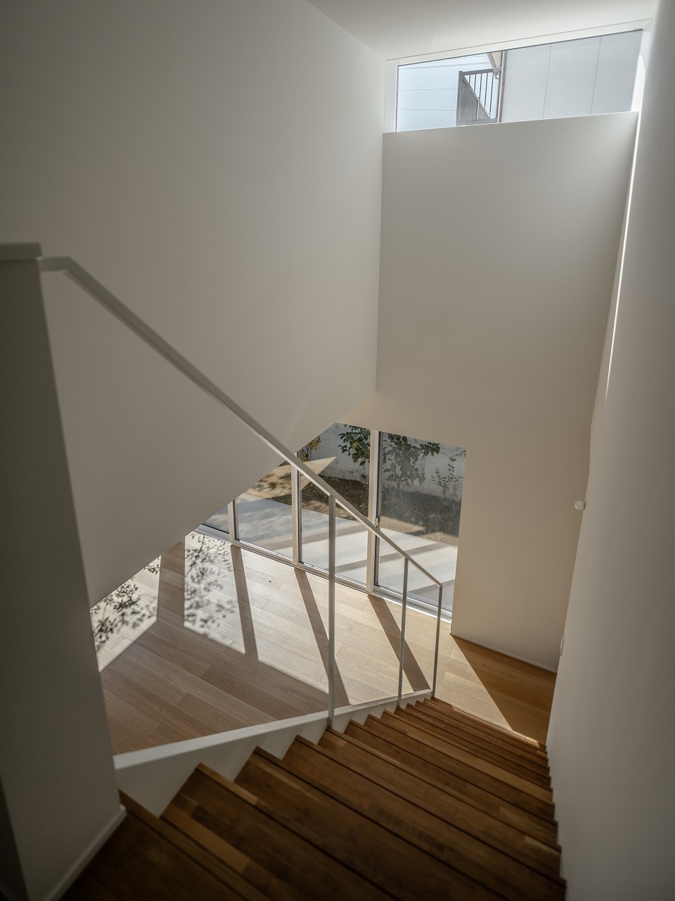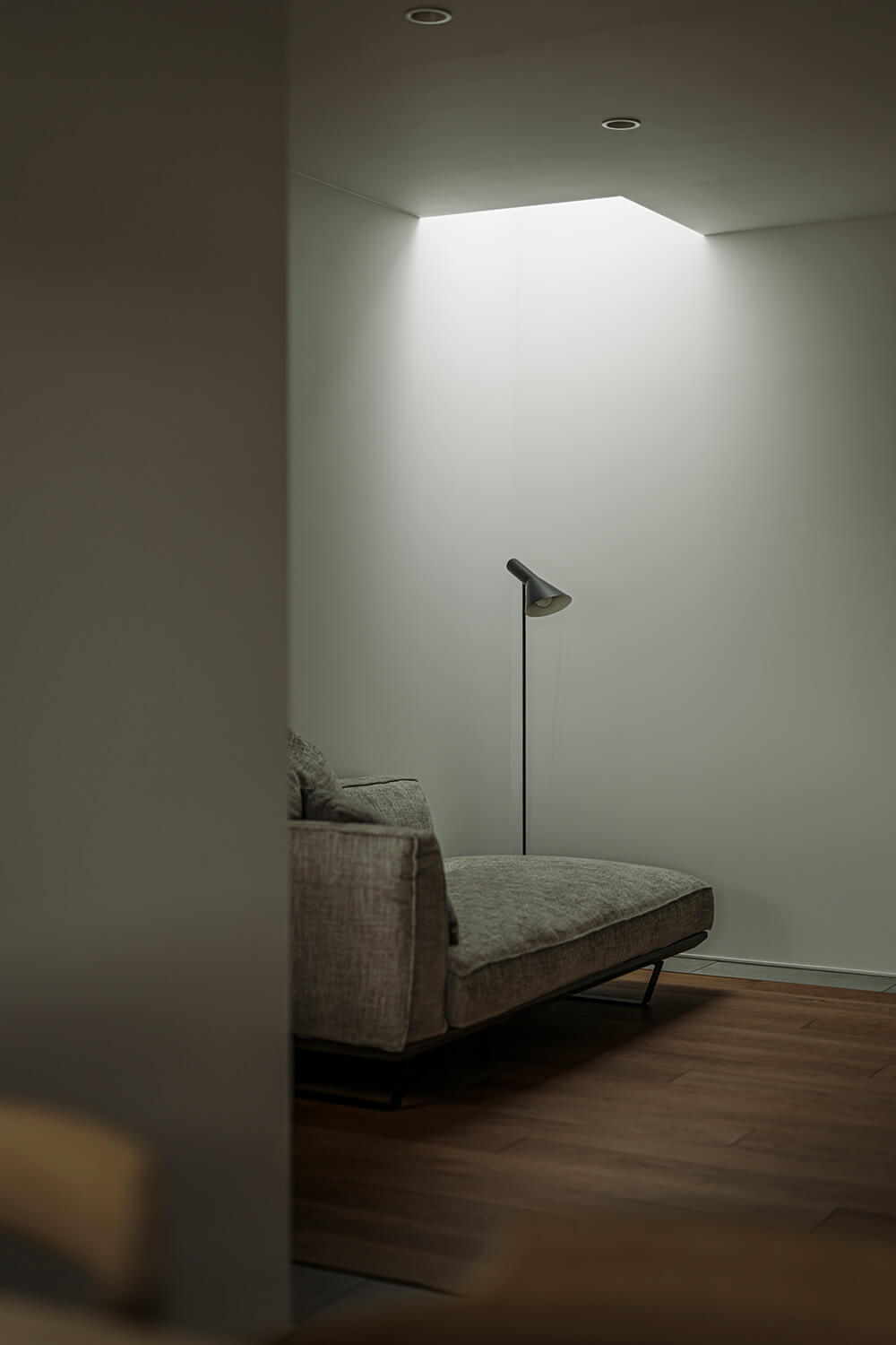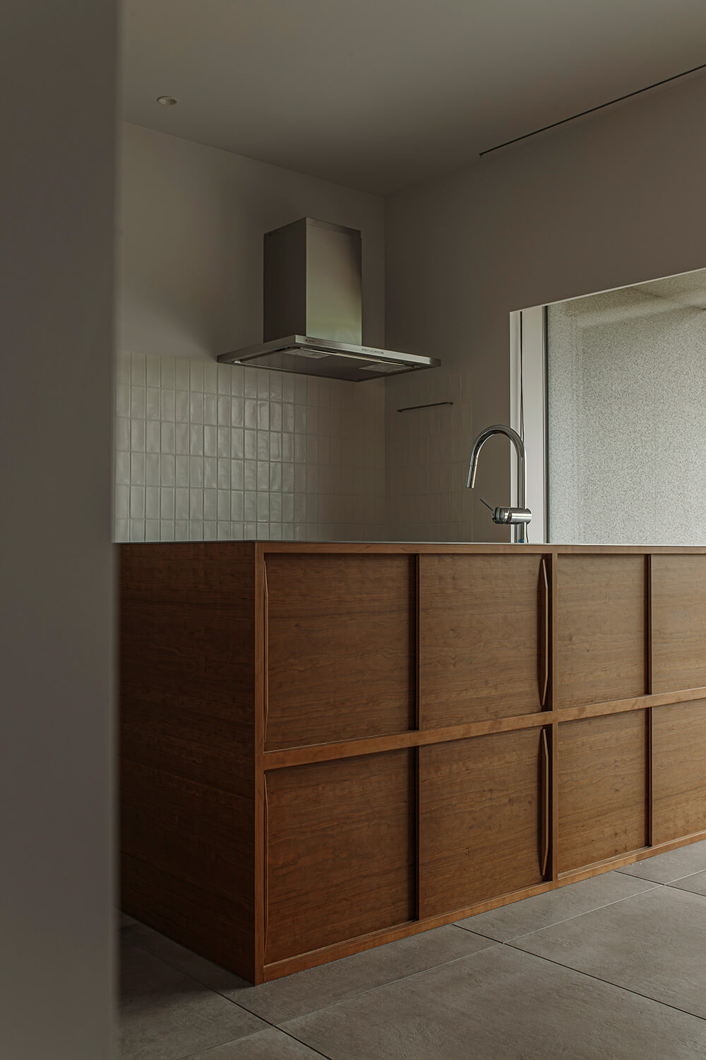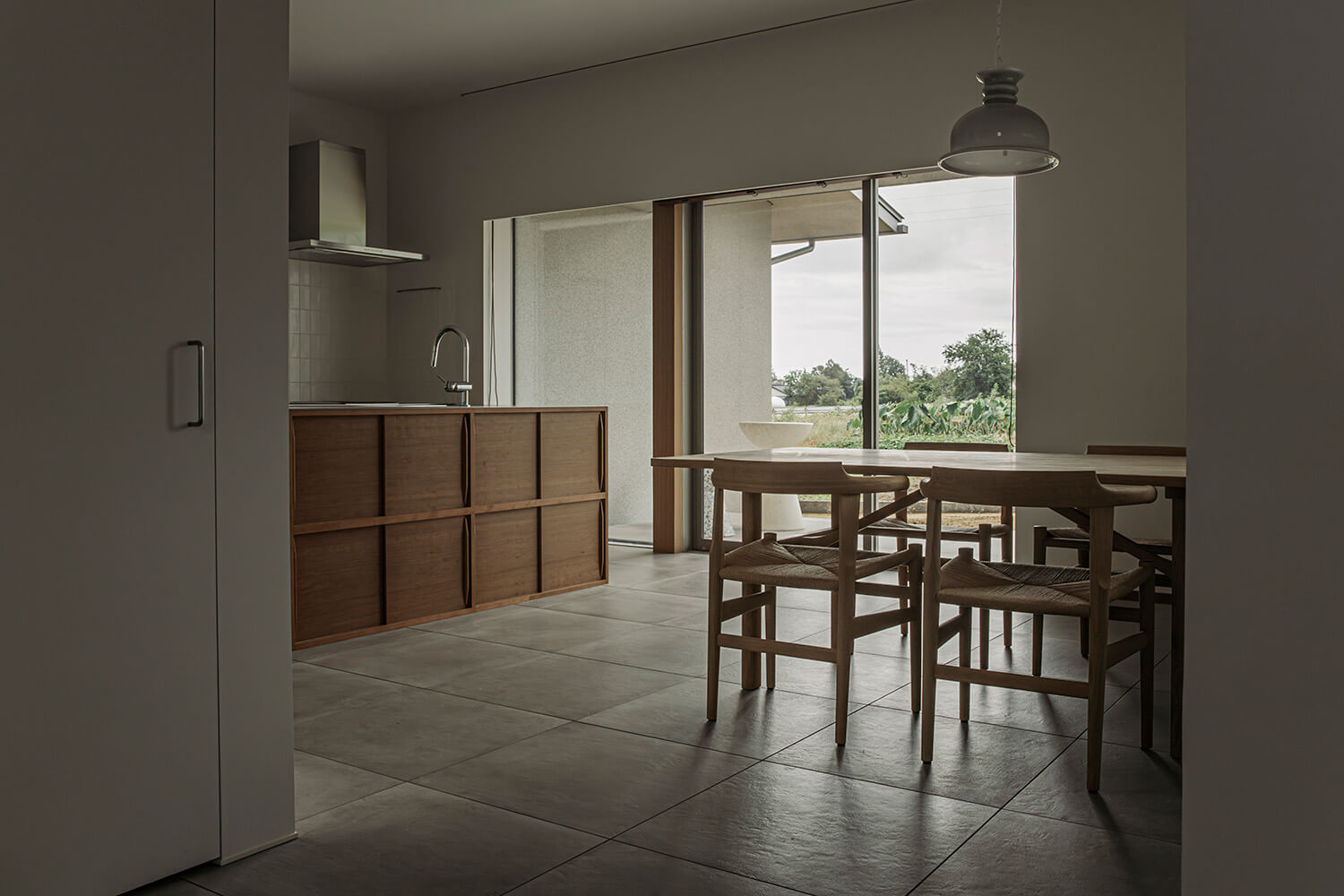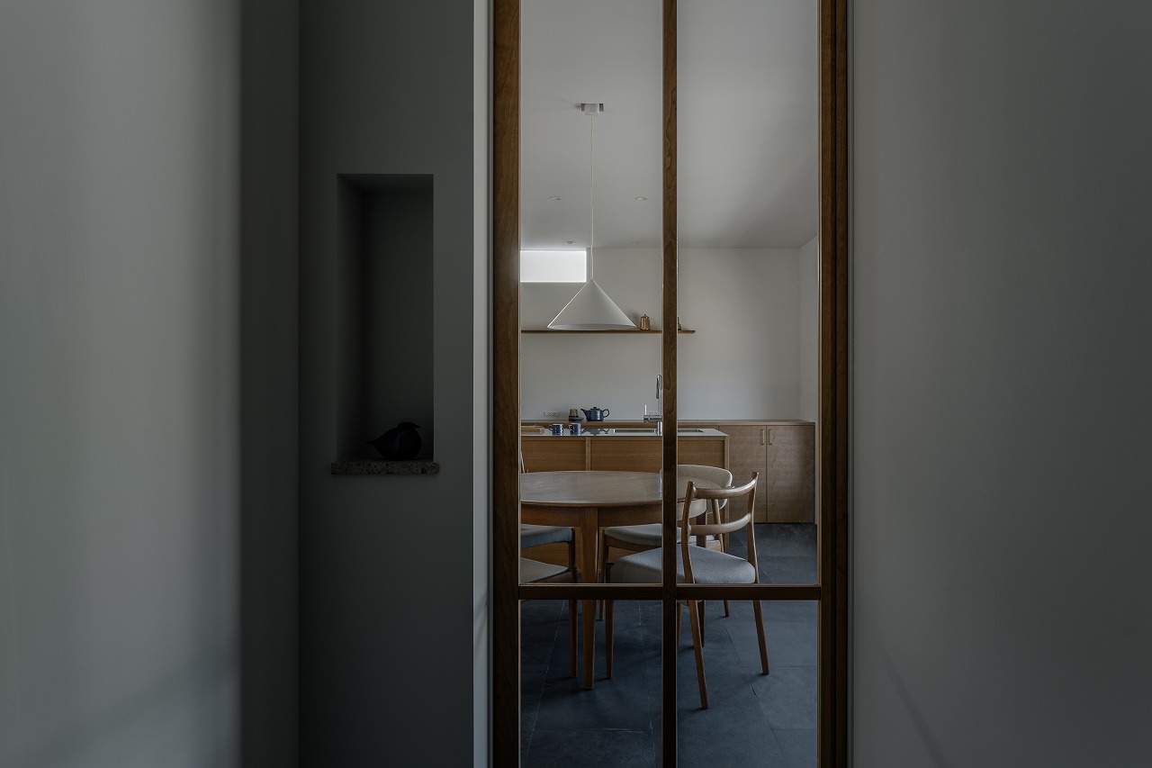 露地に面する細く長い土地の形状を活かした住まい。周辺環境を読み取った光の取り入れ方や視線の抜けが、間口の狭さを感じない空間をつくります。 視線が奥まですうっと抜けるような奥行きを感じる住まいです。