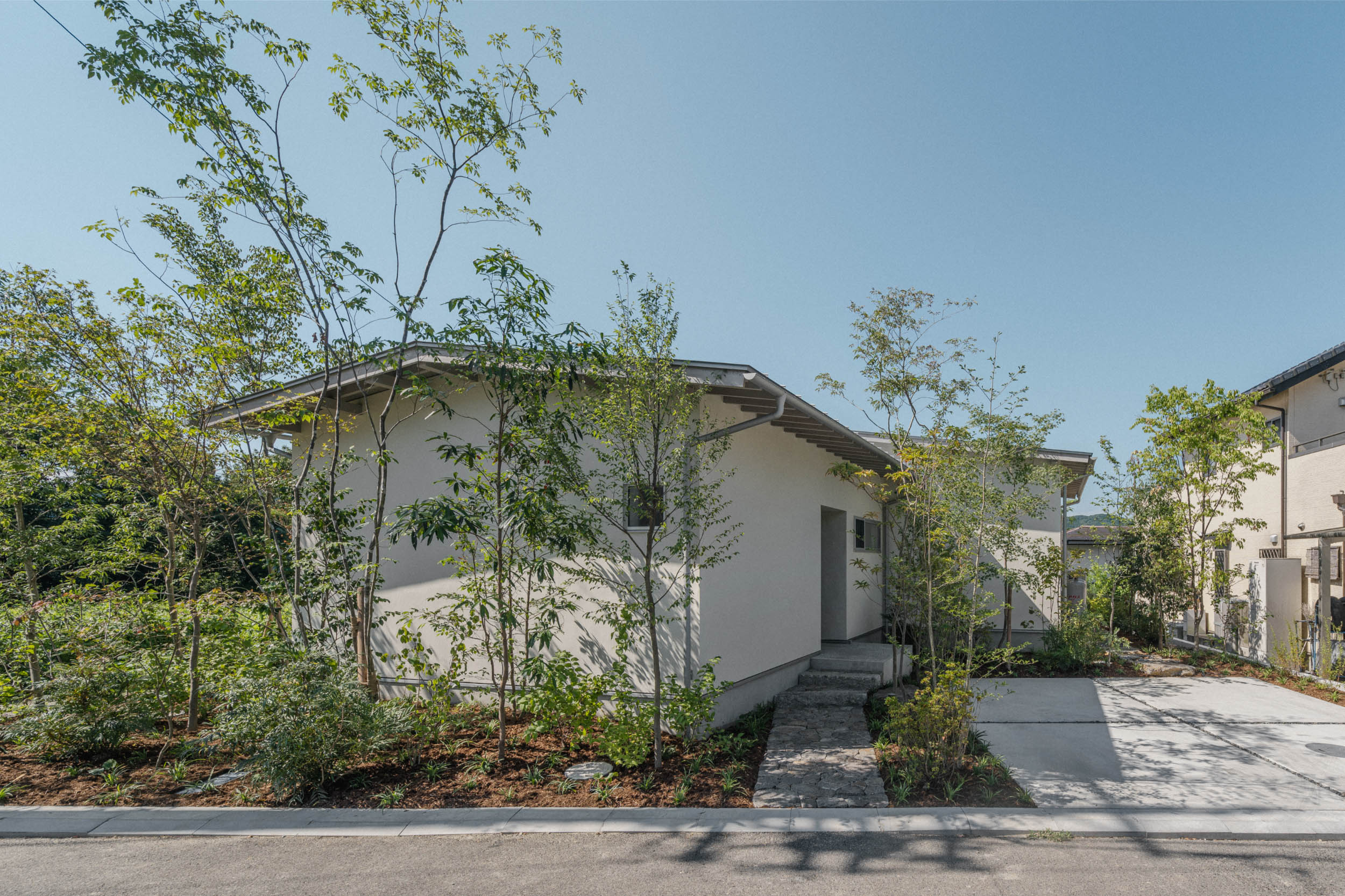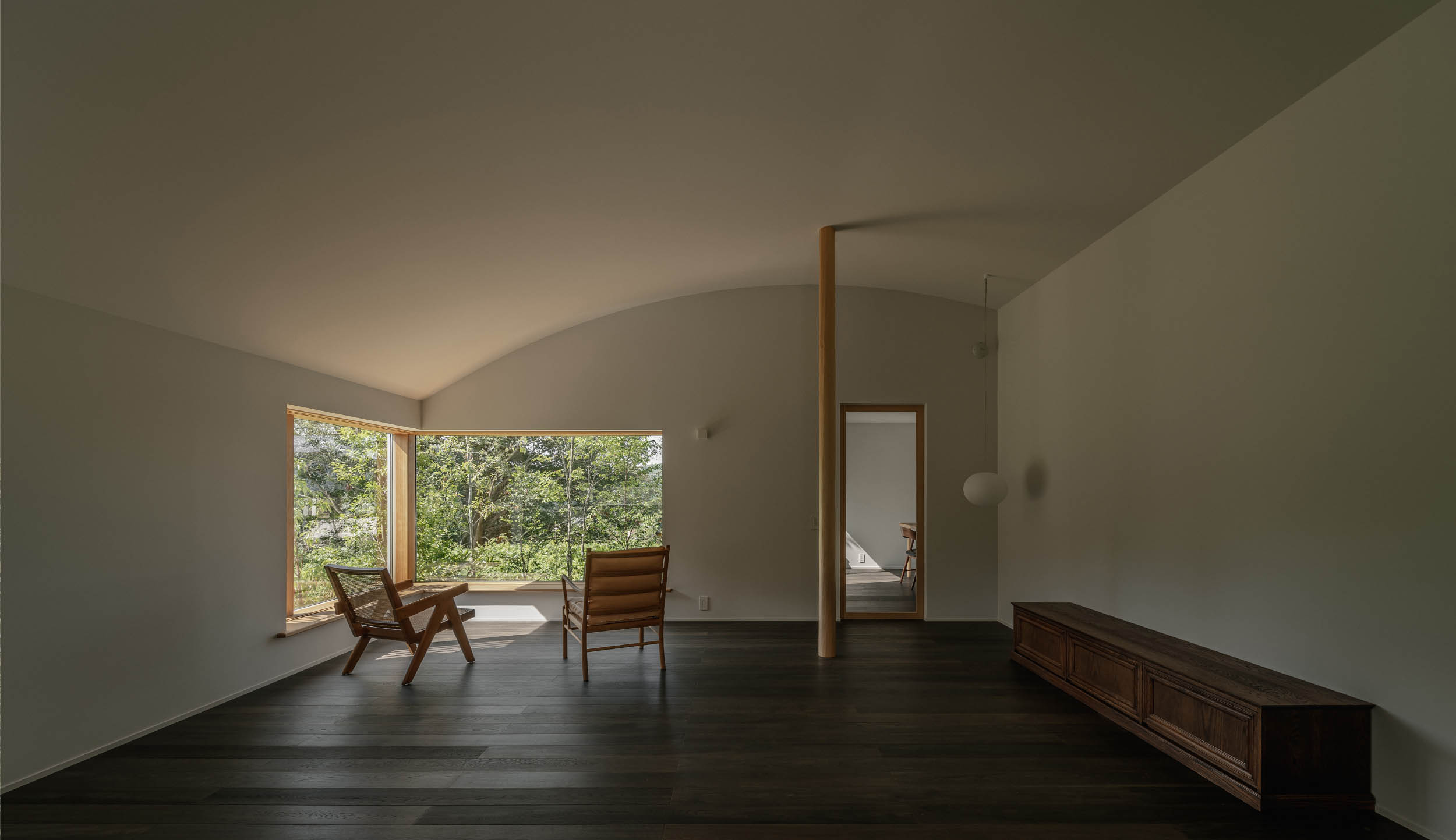 猫と暮らす平屋の住まい。山景を望む、緑豊かな敷地でのご計画。 家族が集まる広間を設え、アール天井が柔らかく暮らしを包みます。