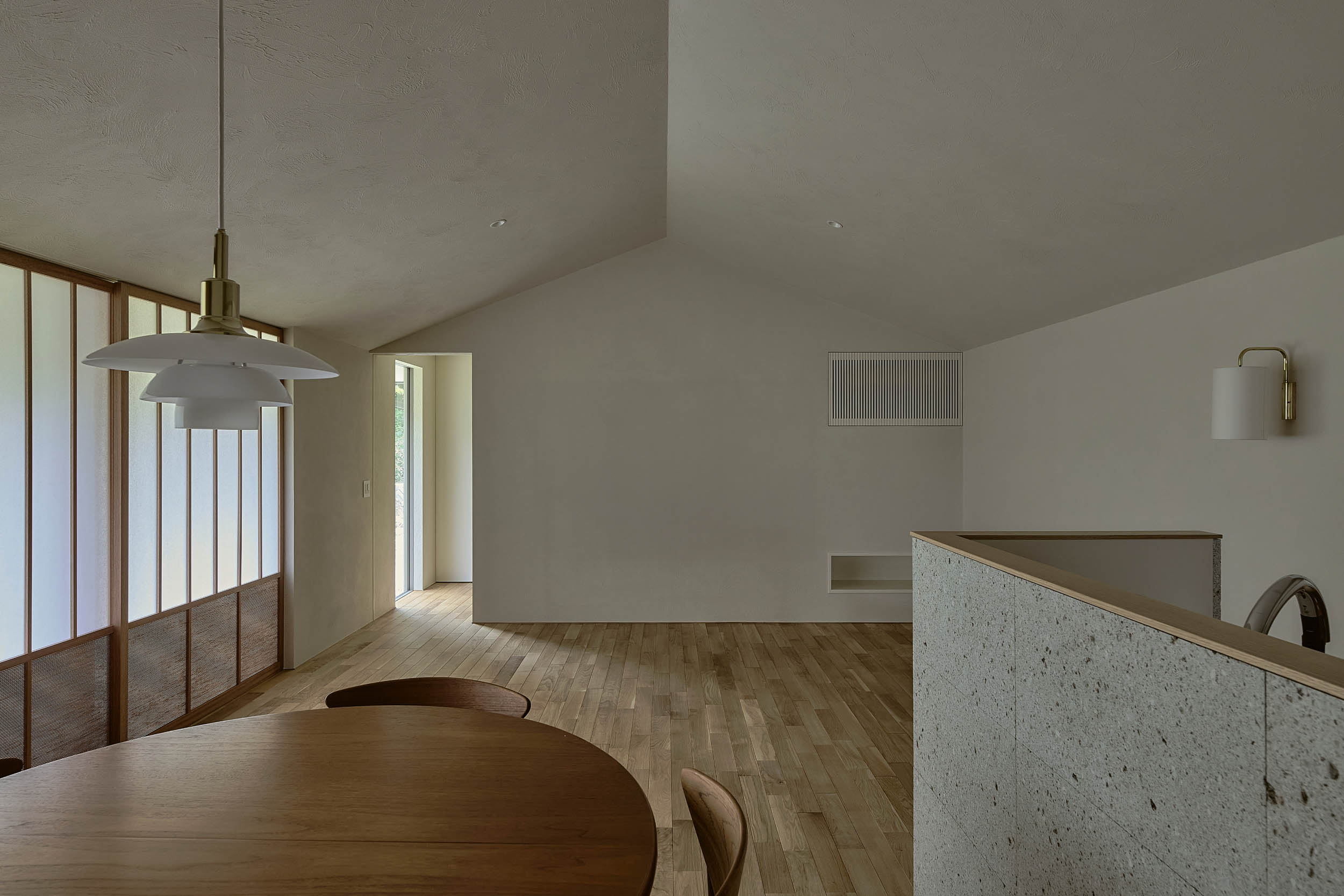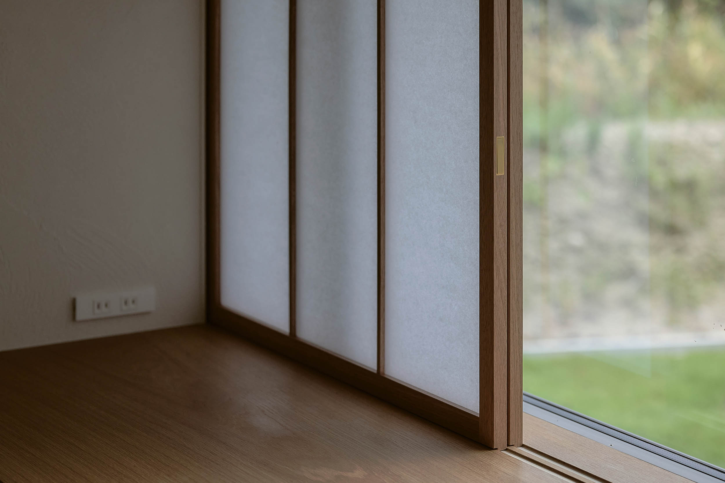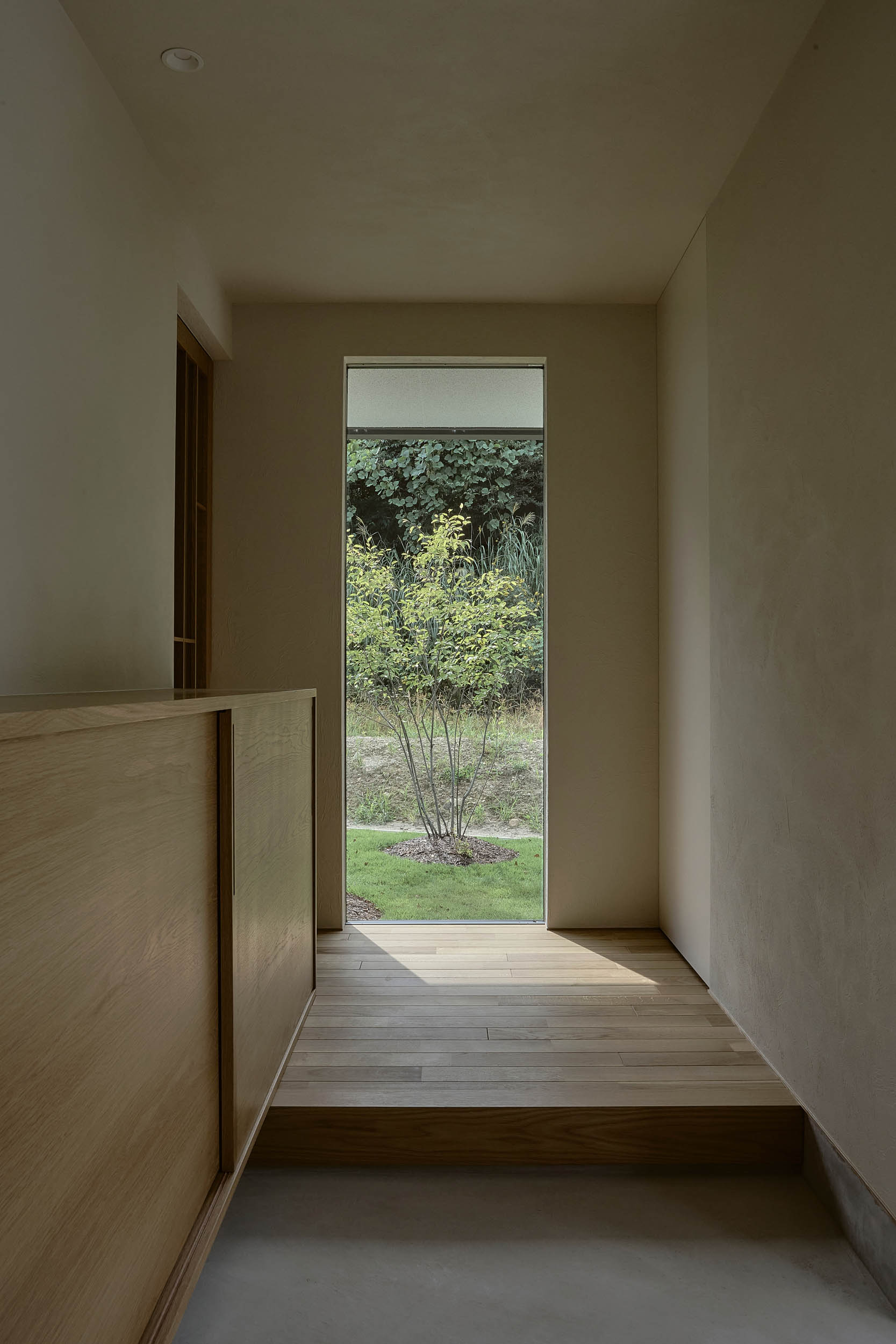 おおらかな土地に対してL型に建物を配置し、周囲からの視線に配慮した庭を設けました。 庭を通してご家族の暮らしがつながります。季節の移ろいや素材の風合い変化を愉しむ暮らしです。