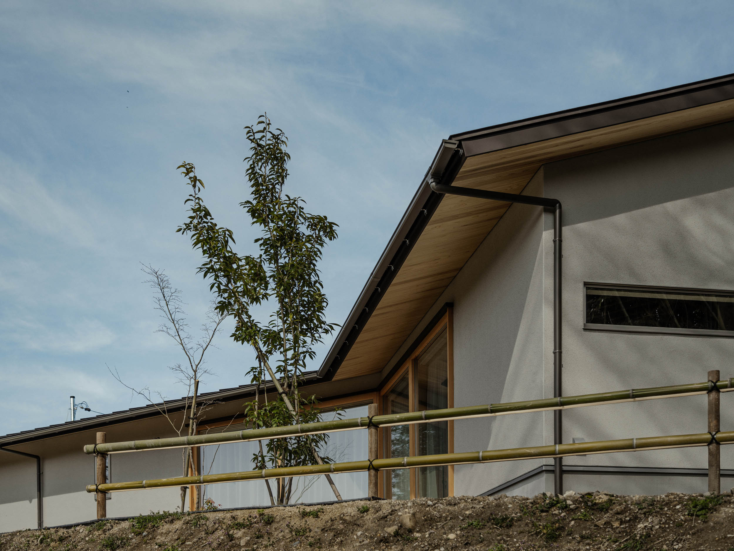 南垂れの丘の上に建つ平屋の住まい。眺望に考慮して建物を「く」の字に曲げ、切妻屋根をかけました。 シンプルな構成としつつ余白を持たせることで時が経っても美しく心地良い空間を目指しました。