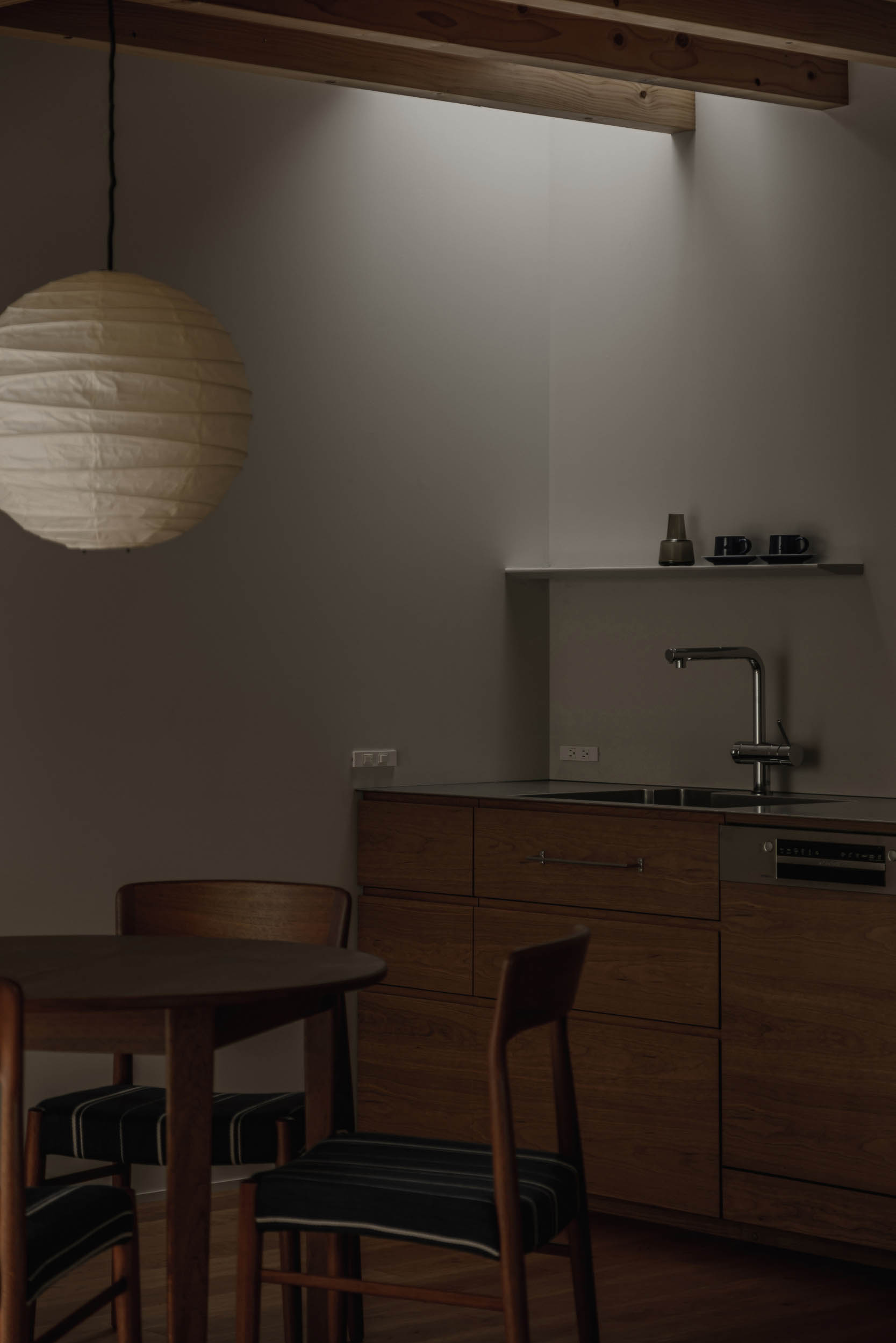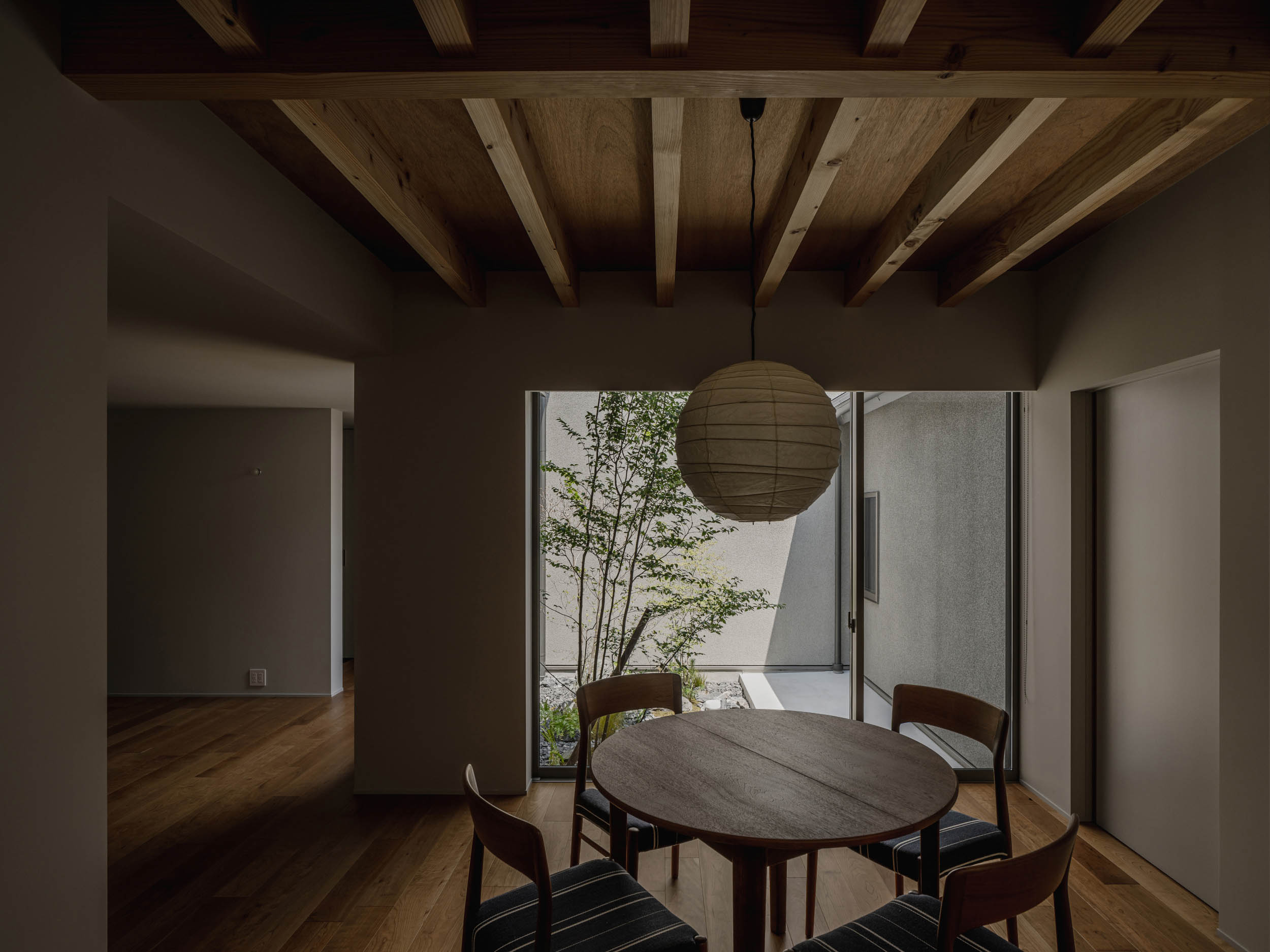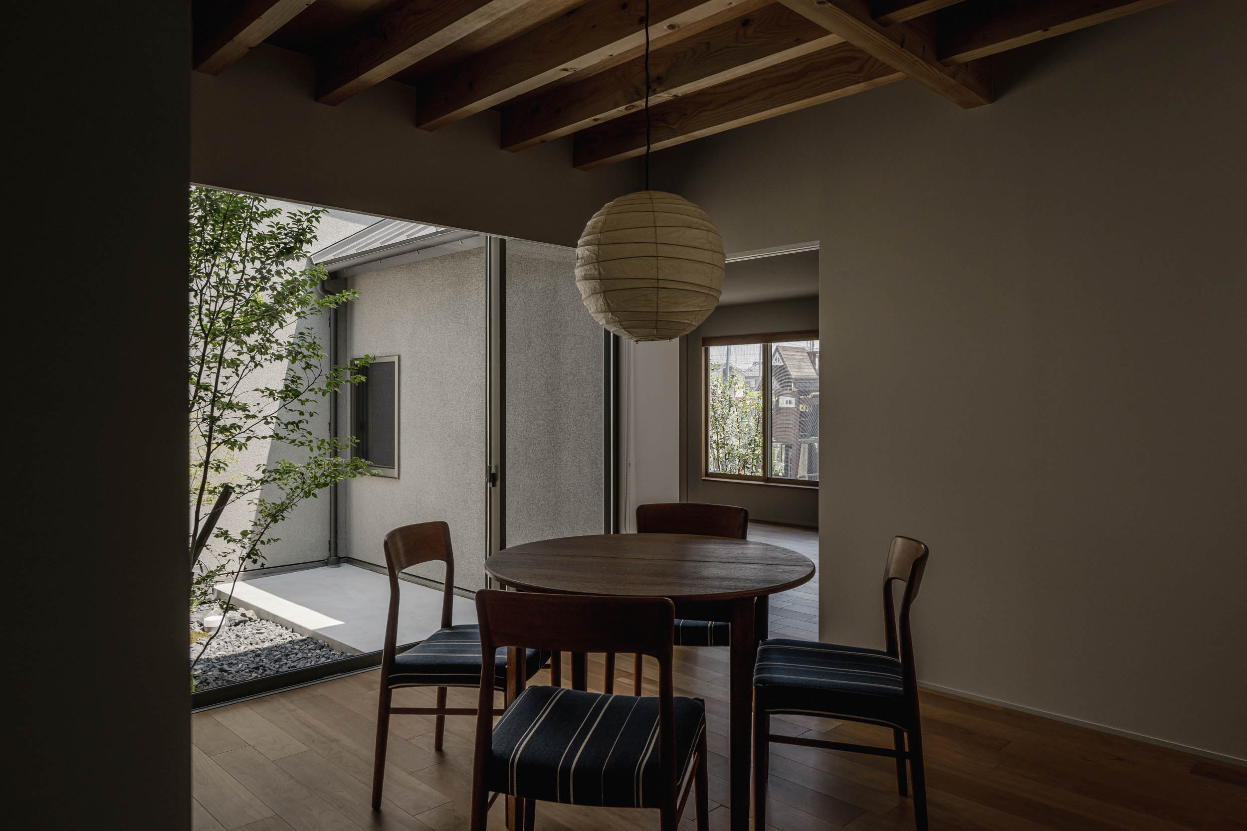 日常の動線に庭を差し込み、自然を暮らしの中に織り込む構成とすることで、3階建てが隣接する住宅街の中でも豊かさを感じられる住まいとしました。 暮らし手の好きなお料理、家具雑貨が引き立つ余白を設けた住まいです。