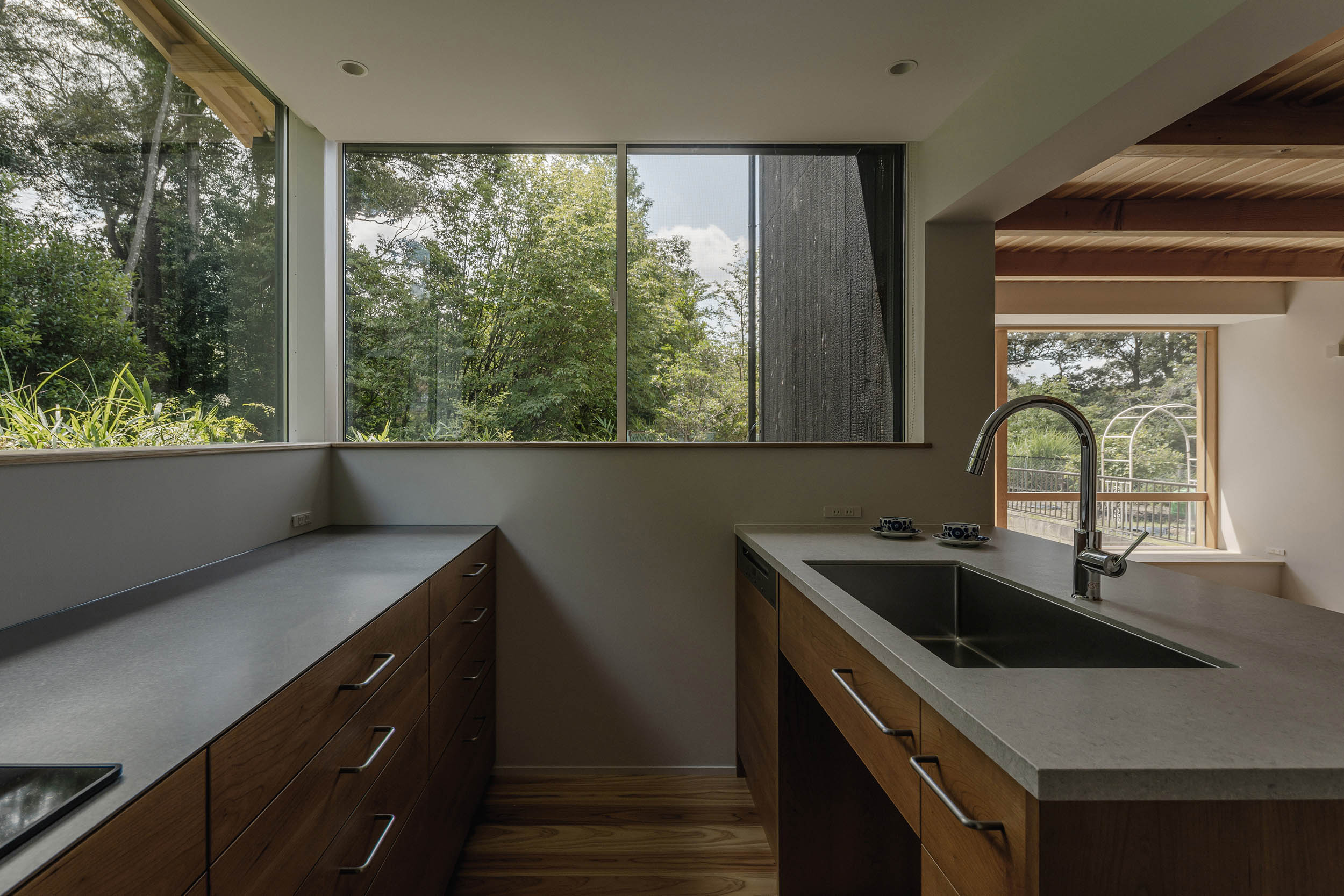 南東には青々とした緑が生い茂る敷地でのご計画。緑に寄り添いながらも居場所によって緑との関わり方が変わるように設計した住まいです。 外壁には焼杉をあしらい、周辺の緑と調和するような佇まいを目指しました。
