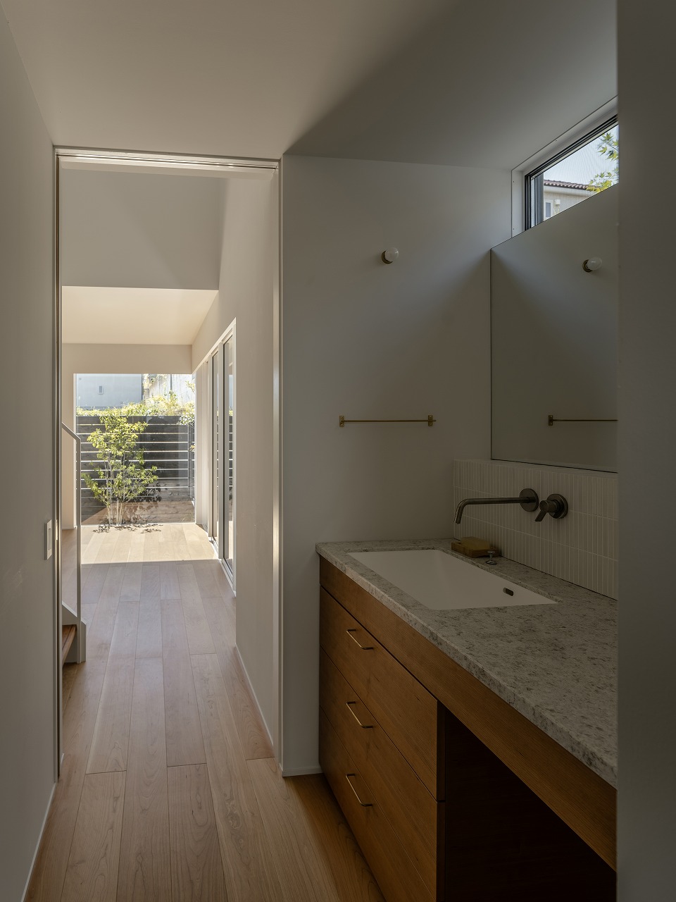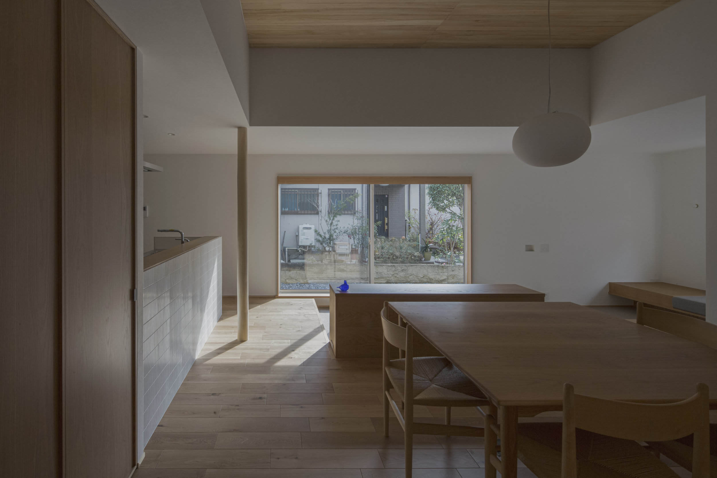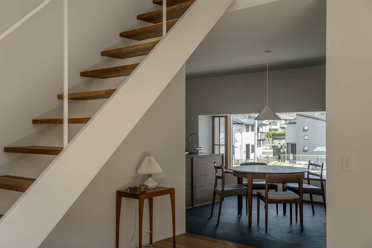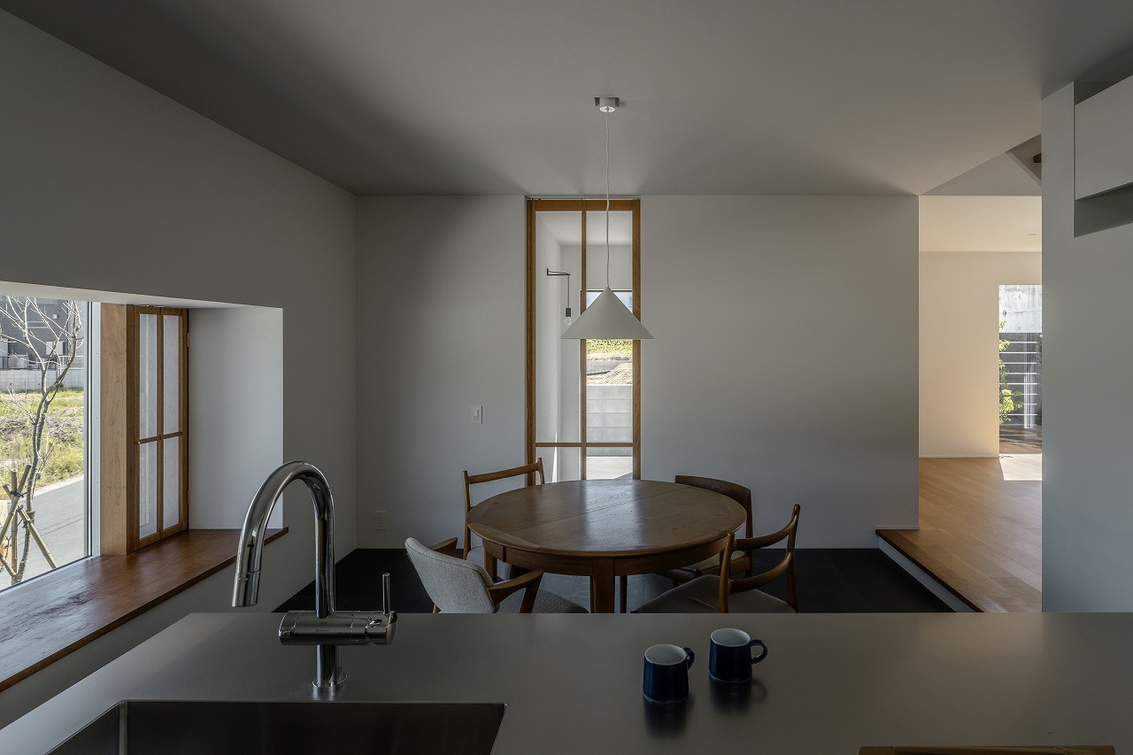 北東側の林への眺望を生かした腰掛けられる窓。反対に位置するコンクリート擁壁を生かした緑の映えるお庭。北東と南西の大きな窓がつなぐ2つの緑景のあいだに、お好きな家具や小物が美しくそこに在る。そんな景色と家具に囲まれた暮らしを愉しめるように計画しました。