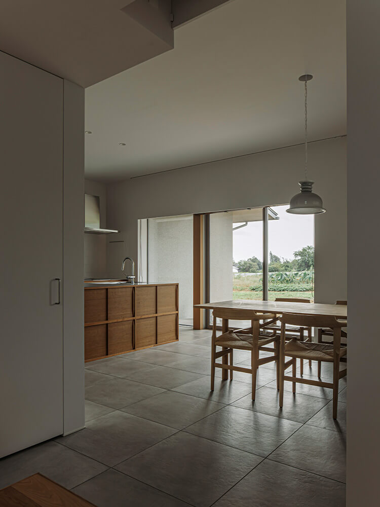 「外とつながら開放的な空間」「景色を切り取る窓」という2つのイメージを大切にし、それぞれの場所での過ごし方を想像しながら建物の配置、窓の位置など検討を重ねました。ダイニングキッチンは、軒を深く出したテラス空間を、室内と連続してつくることで、北側の景色を望む開放的な空間としています。リビングのカウンターや書斎、廊下の先のベンチなど、たくさんある居場所から、多くの豊かさを感じていただける家になって欲しいと願っています。