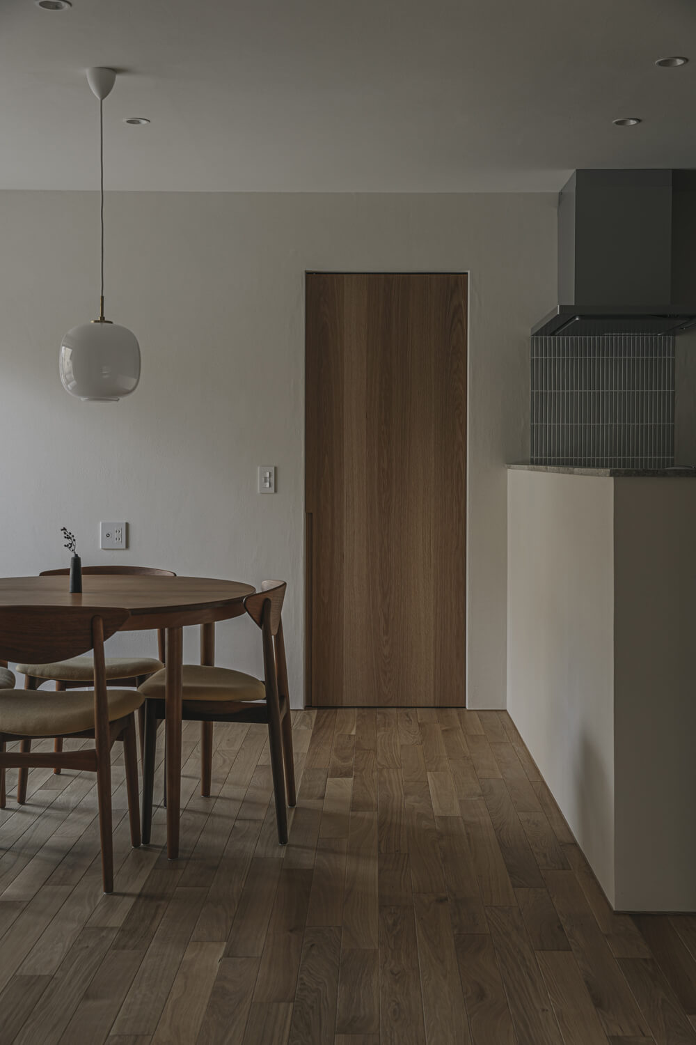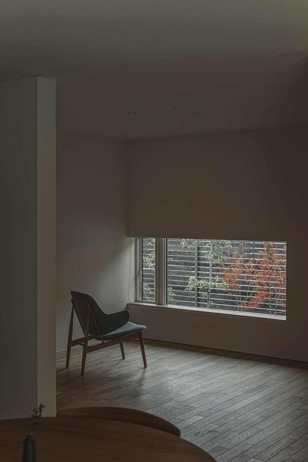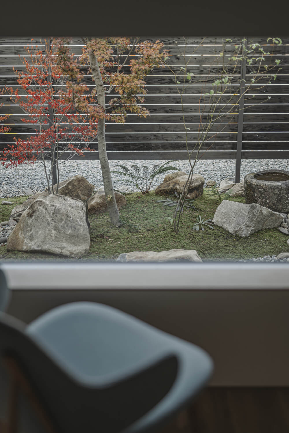 L字型に構えた平屋は、道路からの視線をやわらかく受け止め、暮らしを静かに守ります。南と北、ふたつの庭に開かれた窓からは、風が対角に抜け、視線も心地よく広がっていきます。人生を穏やかに受けとめる、安らぎの終の棲家です。