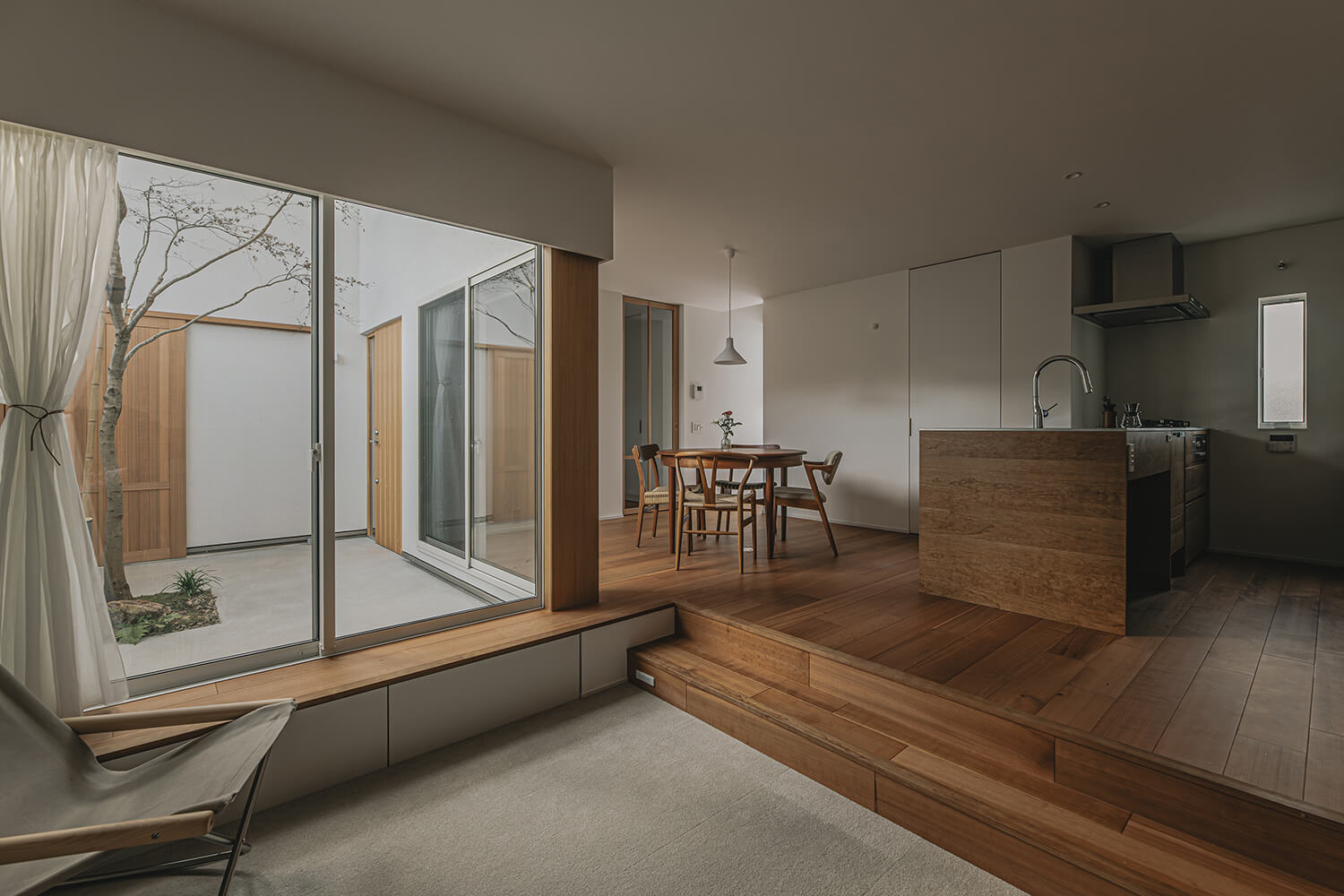 開口の方角と高さを入念に検討することで、中庭を介して取り込む光が室内を安定的な明るさに保ちながら、隣地からの視線を遮る障壁としての役割を果たします。