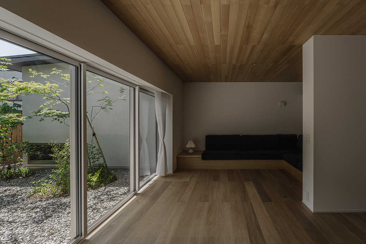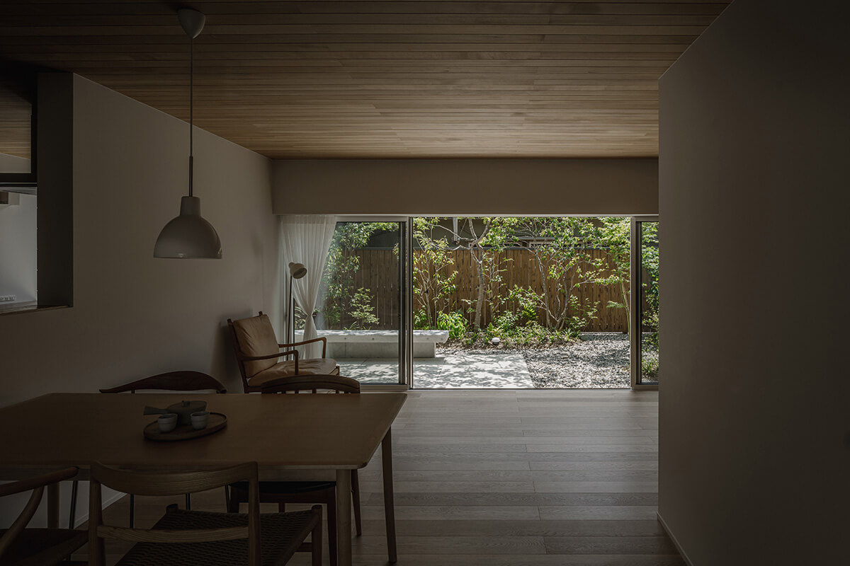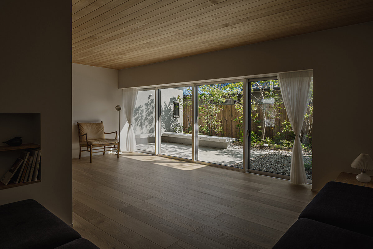 外から家へ帰り、リビングでゆったりと過ごし、各々の個室へと帰っていく。それぞれのシーンの中で緑のある風景が暮らしのそばにあればと思い、北と南に大きな中庭を配置しました。北庭は空への視線が奥へと抜けるように。南は太陽で照らされた床が庭へと広がっていくように。2つのお庭が暮らしを緩やかに包む平屋の住まいです。