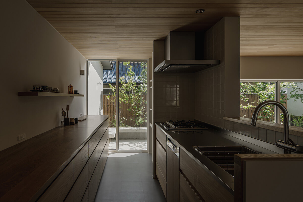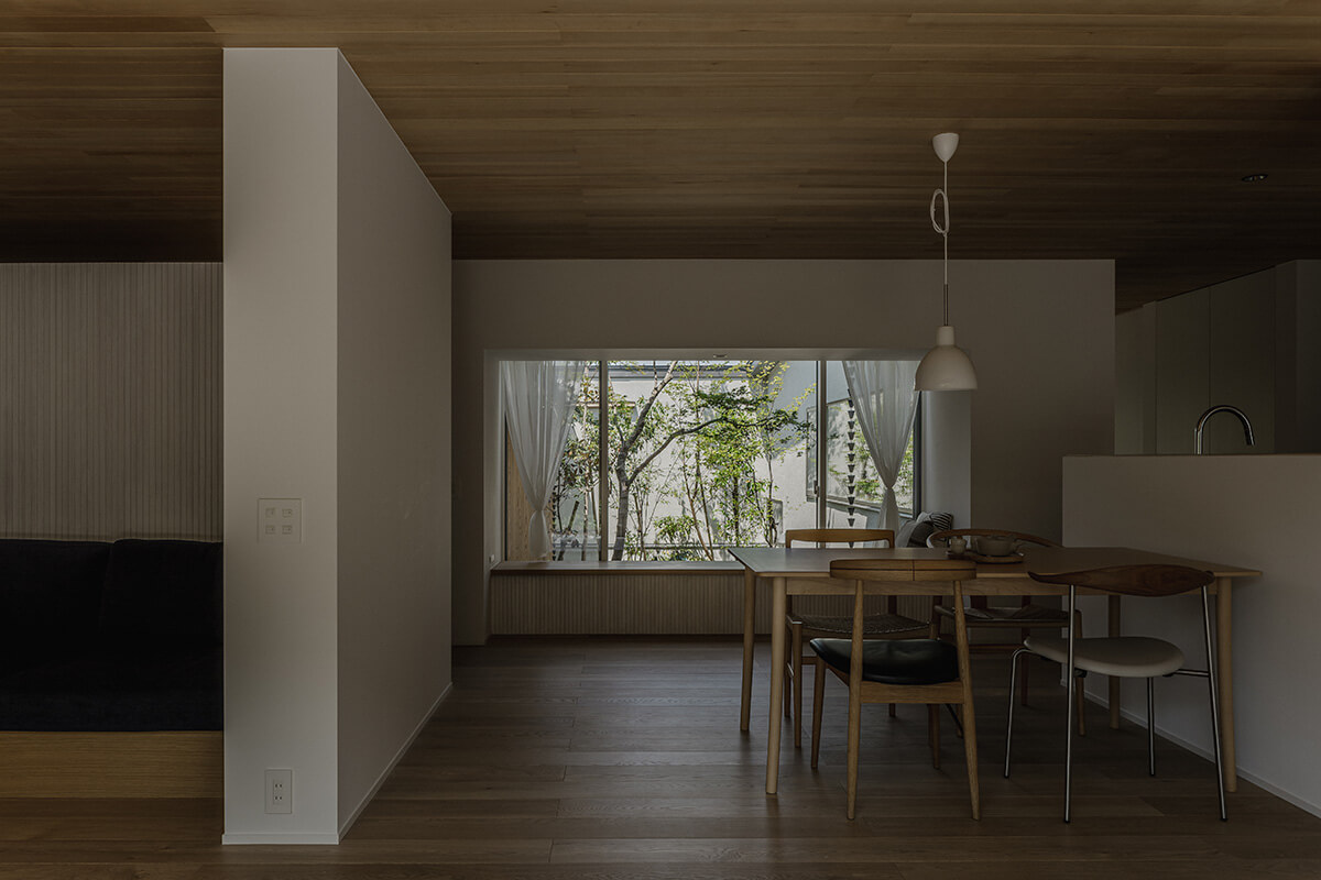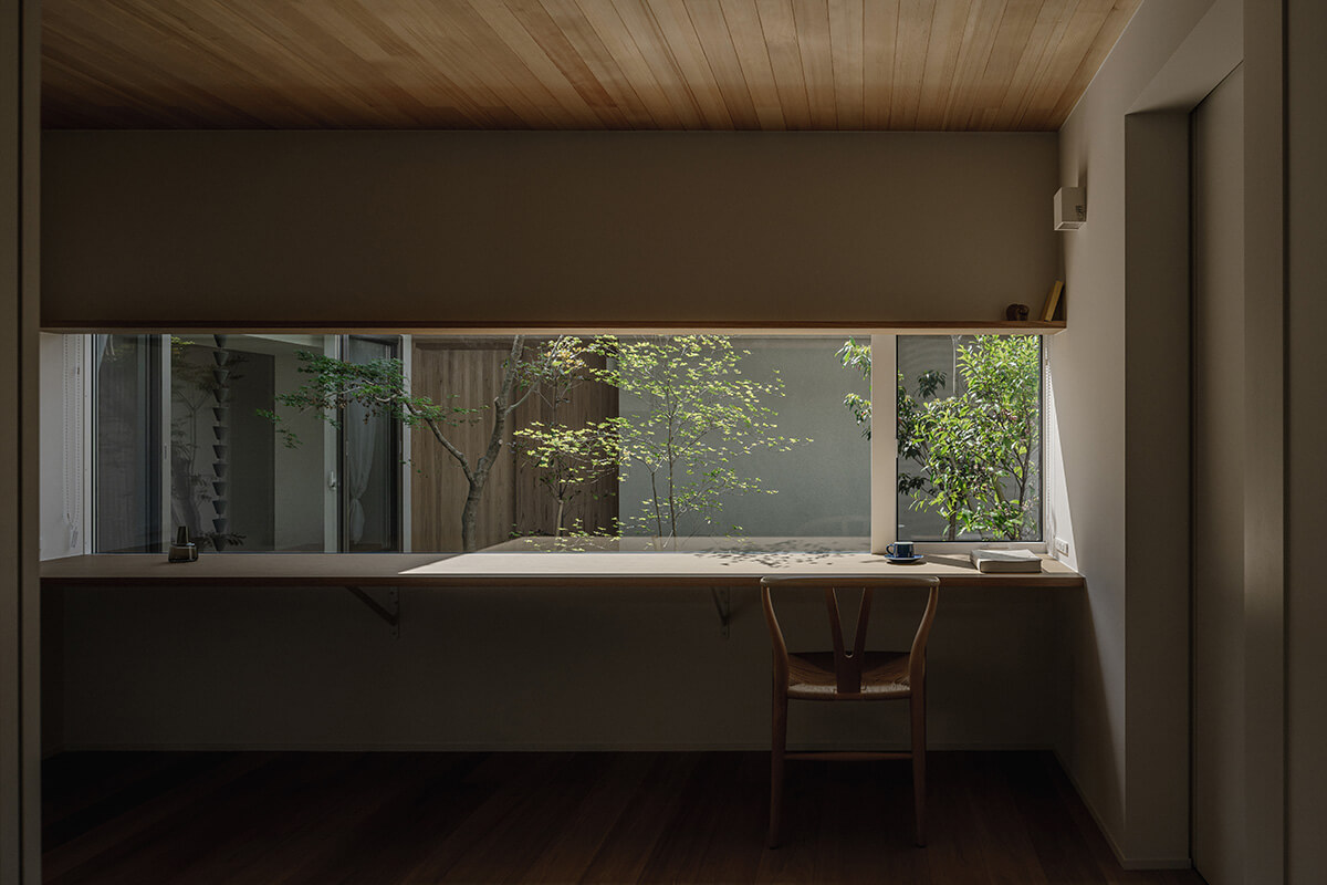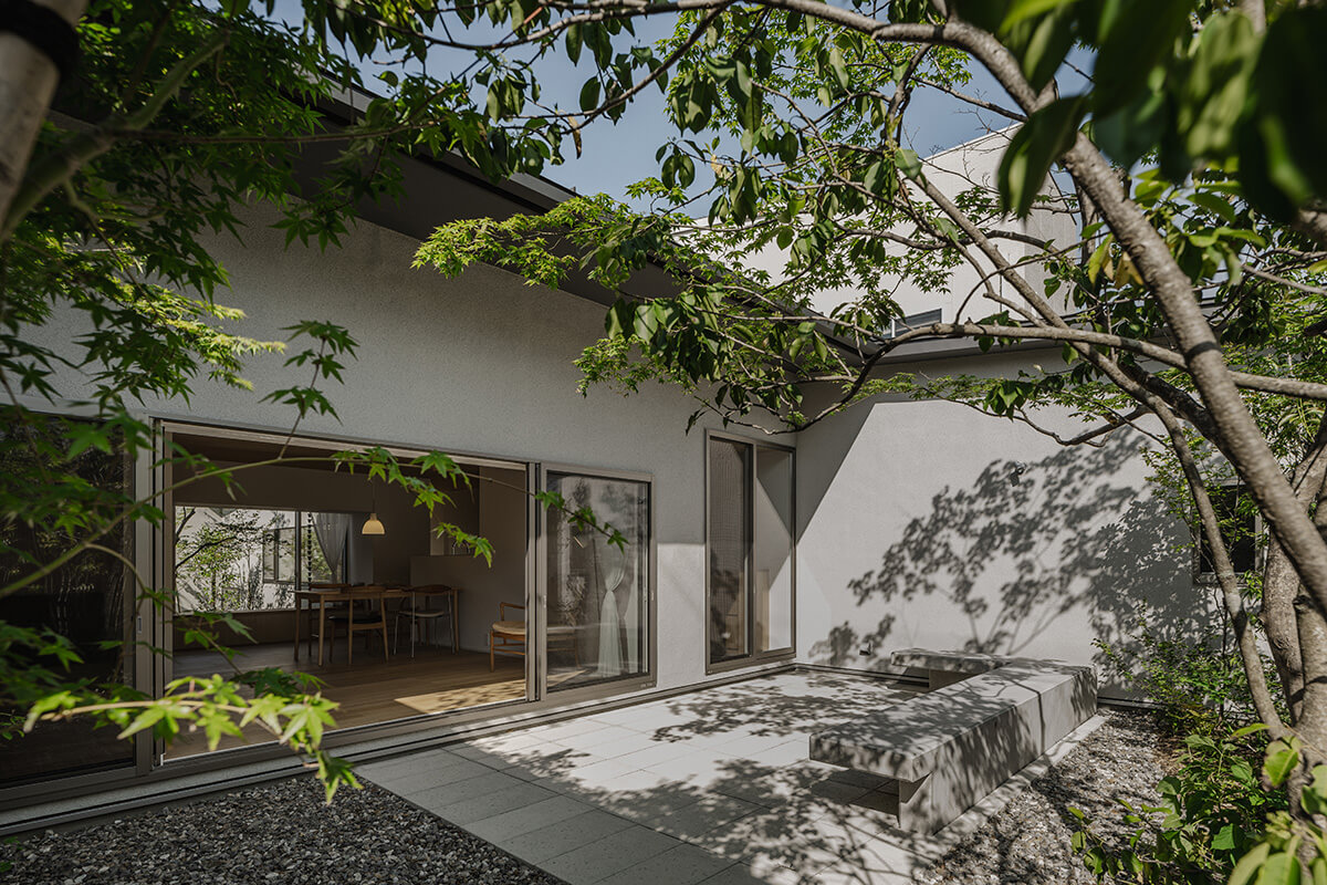 外から家へ帰り、リビングでゆったりと過ごし、各々の個室へと帰っていく。それぞれのシーンの中で緑のある風景が暮らしのそばにあればと思い、北と南に大きな中庭を配置しました。北庭は空への視線が奥へと抜けるように。南は太陽で照らされた床が庭へと広がっていくように。2つのお庭が暮らしを緩やかに包む平屋の住まいです。