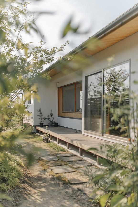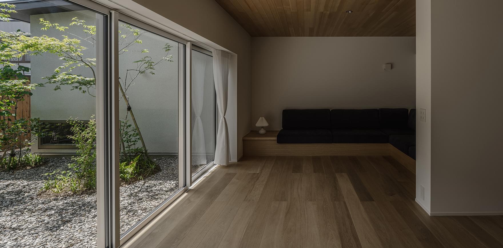 南北に抜ける庭と、その間に設けた中間の居場所が、光と風の通り道となり、住まい全体にやわらかな明るさと心地よい空気を届けます。