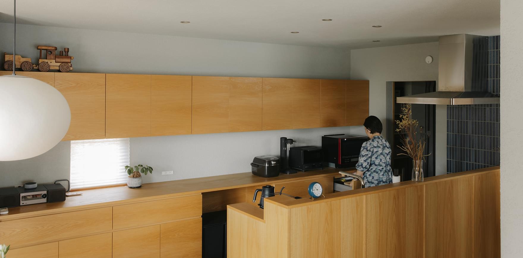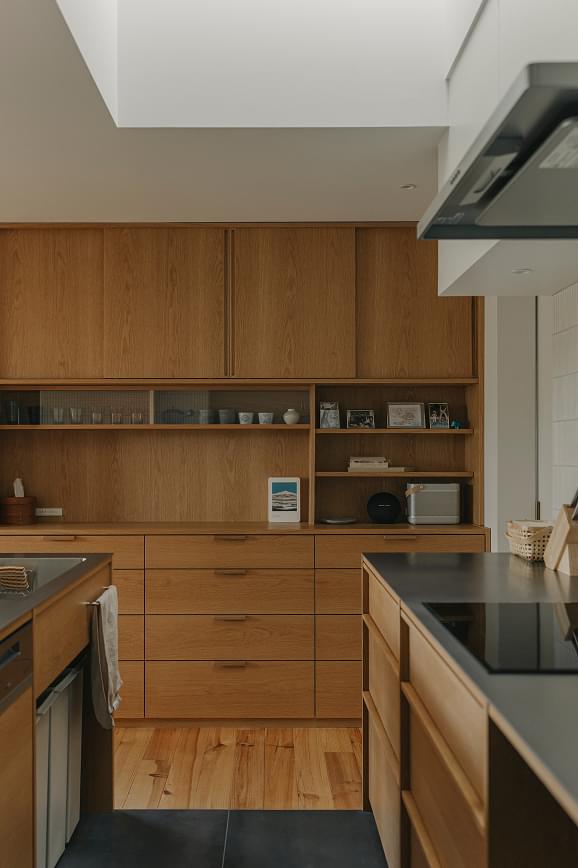 また、キッチン上部のトップライトは最小限の開口でも光と風を取り入れ、自然な換気とともに、やわらかな明るさを空間にもたらします。機能に寄り添いながら、感覚にやさしく馴染む住まいが、そこにあります。