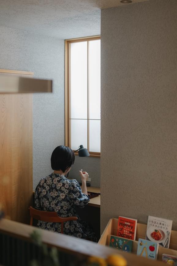 角地の豊かな光に調和するよう、室内はグレーの左官仕上げに。やわらかな光が空間に広がり、書斎やキッチンまで心地よく届きます。
