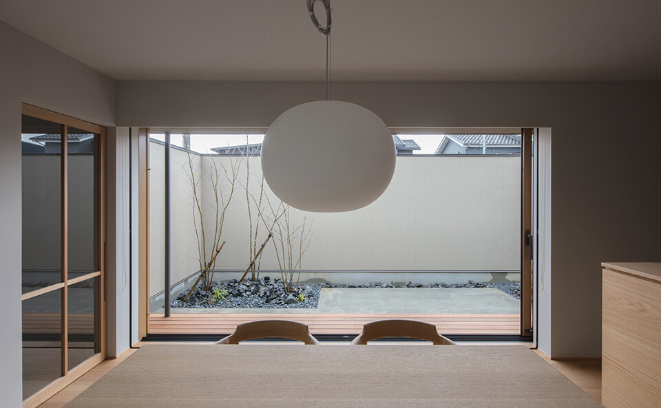 落ち着きを感じる「和」の空間を意識し、自然との調和を図ることで落ち着きのあるひとときを過ごすことのできる住宅となっています。