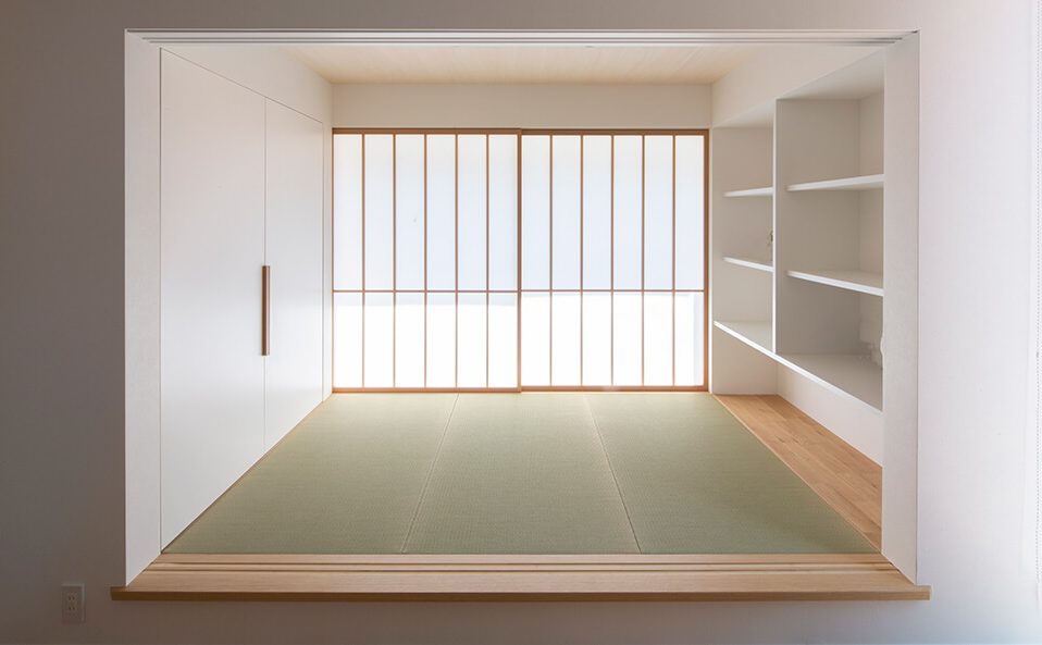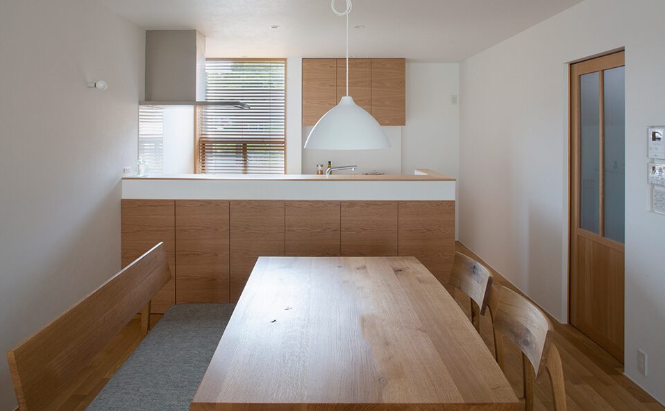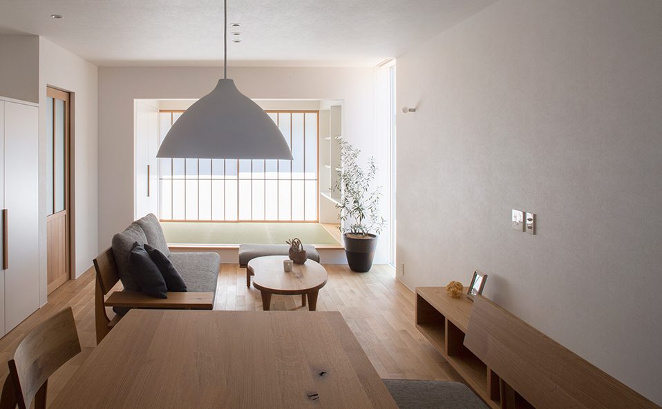 敷地は住宅密集地にある狭小地。周囲の景観にとけ込む、落ち着いた佇まいとしました。やわらかい朝日が入る畳コーナー。日中の日の光が入るリビング。夕暮れの西日でオレンジ色に染まるキッチン。暮らしの中で刻の流れを感じられる住まいです。