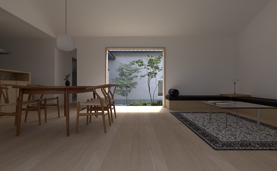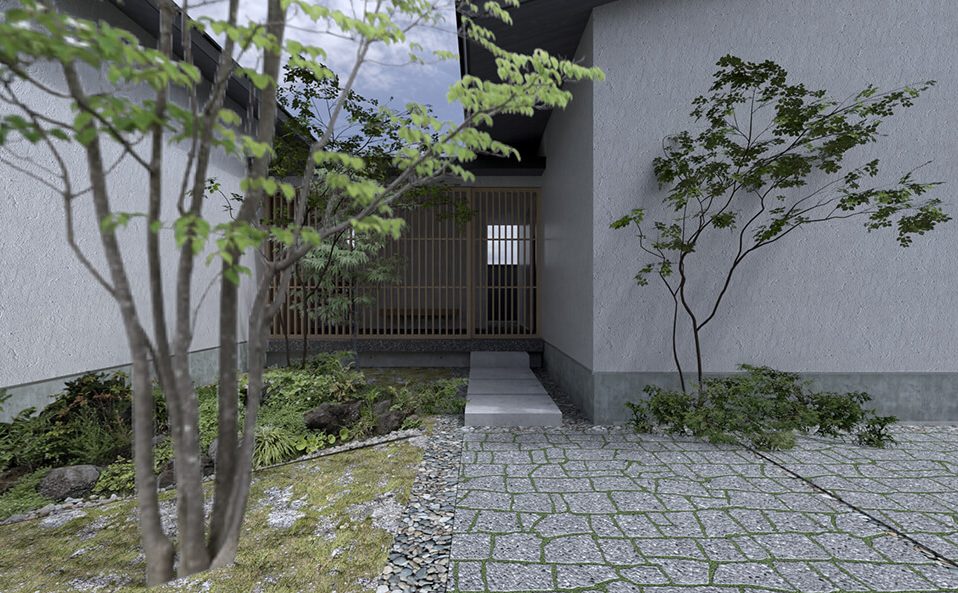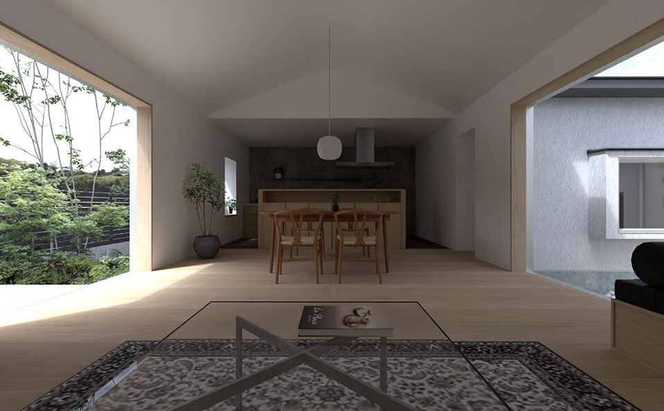 この住まいは、「前庭・中庭・奥庭」の3つの庭を暮らしの中に取り入れた、自然と人が調和する住まいです。それぞれの庭が持つ異なる役割と空間性が、日々の暮らしに季節の変化や癒し、そして家族とのつながりをもたらします。敷地形状と生活動線を活かした庭の配置によって、外とのつながりを感じながら、内に開かれた安心感のある住空間を実現しています。