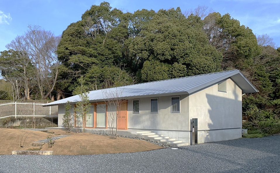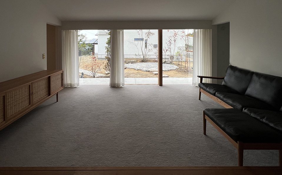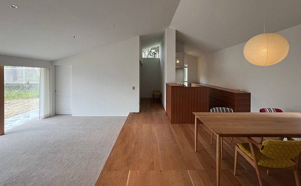 緑あふれる敷地環境に馴染むようにシンプルな切り妻屋根の平屋を計画しました。ゆったりとした敷地に合わせて、家の中でも全体が見渡せるような伸びやかな間取りとしています。カーペット敷きのリビングや1.6m出ている大きな軒下空間や土間テラスなど是非ご体感ください。