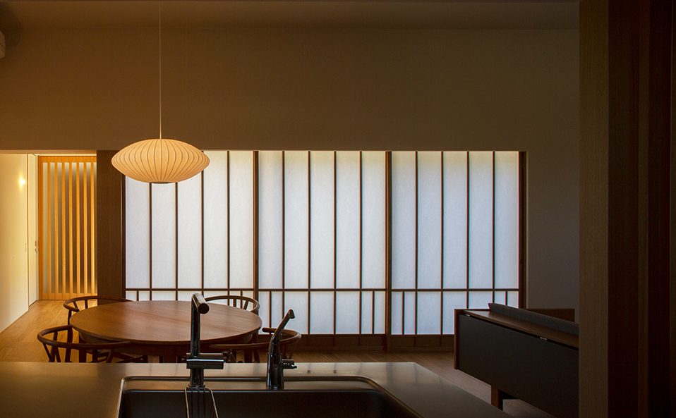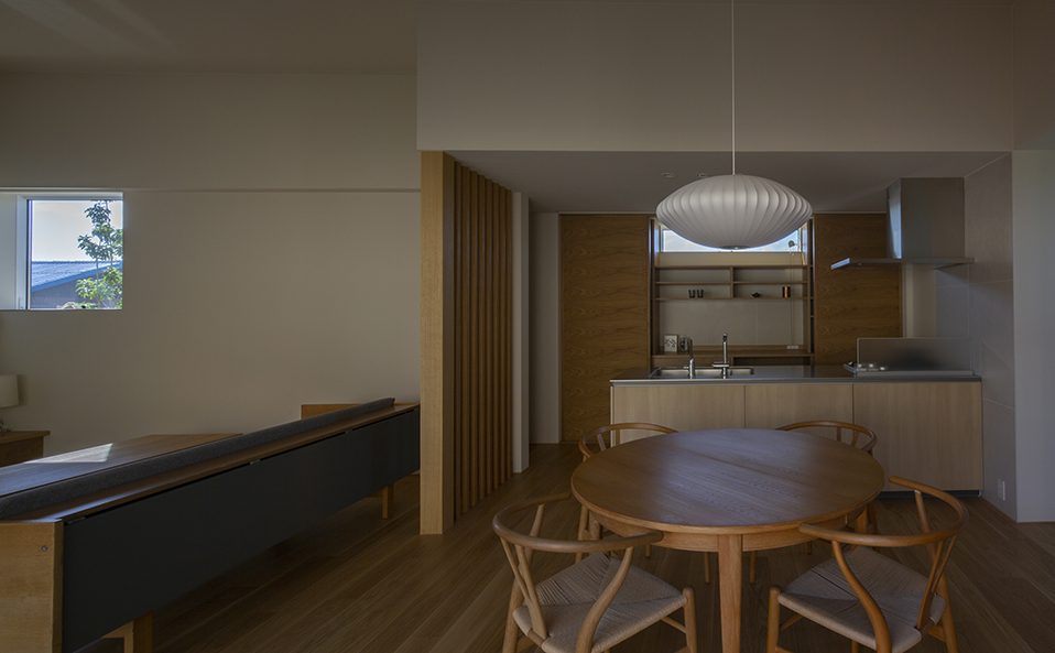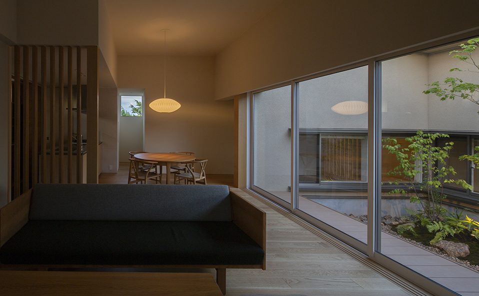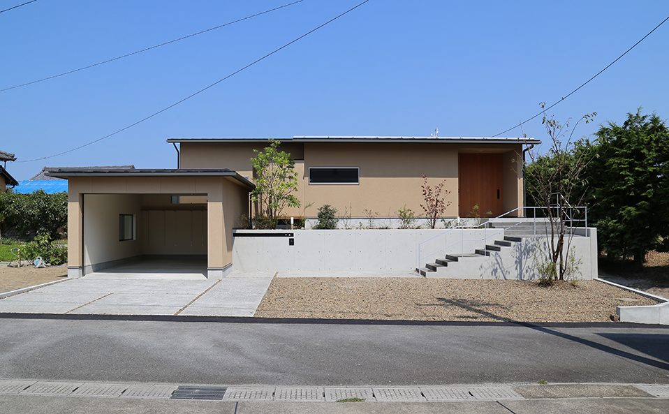 完成してから7年ほど経った住宅で、水害対策の為に高くした敷地の上に建つ平屋です。別棟の車庫とコの字型に平面構成された建物を異なる高さで配置し、またそれぞれの建物の間に緑や光を感じる中庭をつくったことにより、プライバシー保護と開放感を両立させた住宅です。