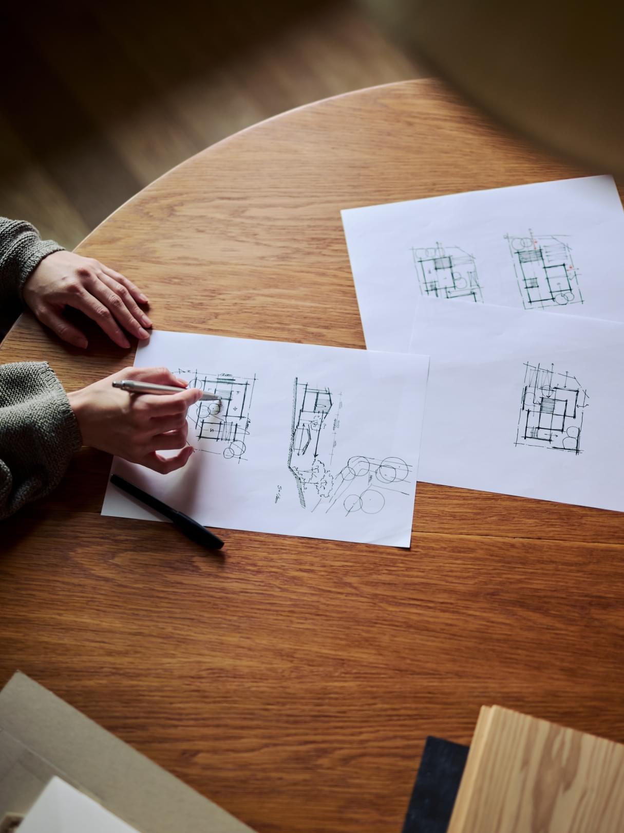 プランを練る時は、最初から細部をつくり込もうとせず、1/200スケールで配置と構成を考えるところから始めます。視野を広く構え、建築としての全体的な骨格や、周辺の街並みや自然との関わりを見つめ、そこで営まれる暮らしの在り方を構想していきます。自らの手を動かし、その敷地、そのご家族に馴染むプランに辿り着けるまで、何度もスケッチを重ねます。