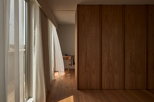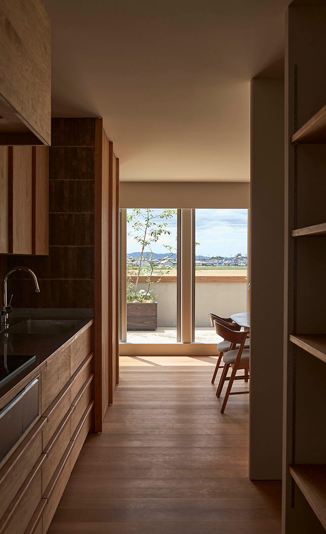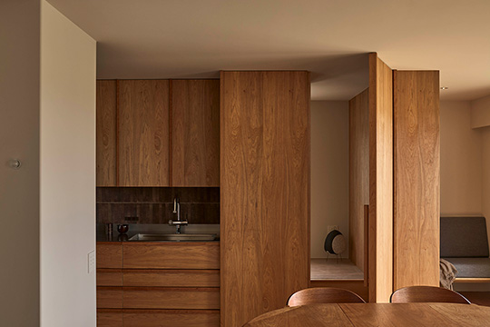 家族4人が心地よく過ごせるよう、家の中にそれぞれの居場所が点在している街のような住まい。既存の窓はそのまま活かしつつ、周辺環境や光の入り方を丁寧に読み取り、幾重にも重ねたプランで空間を構成しました。
